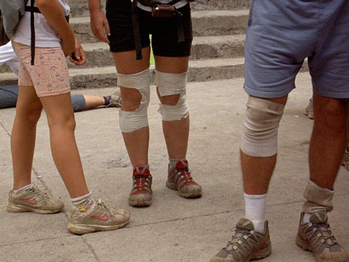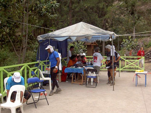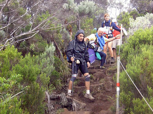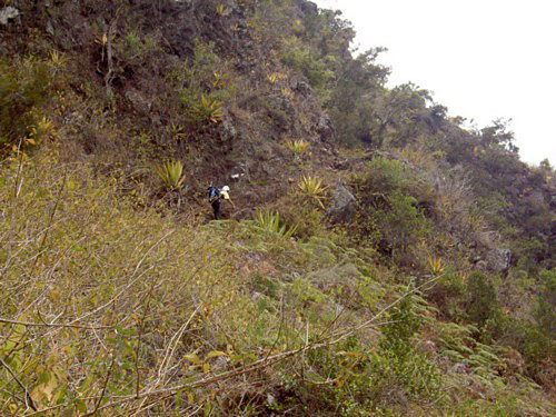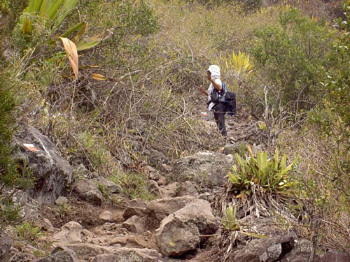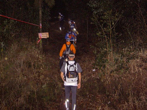 In einer 5er-Gruppe hetzten wir weiter. Zwei Stunden hatten wir für die 10 Kilometer bis zur nächsten Kontrollstelle Zeit. Der Weg war ordentlich, verglichen mit den bisher angetroffenen Bedingungen, es war nicht so sehr steil und wir kamen ganz flott voran. Nur ein Wegstück war einigermaßen problematisch, auf einem schmalen Pfad steil abwärts. An den gefährlichsten Stellen war jeweils ein Stahlseil verankert, das man als Handlauf benutzen konnte und so war nach 15 Minuten alles überstanden. Wir waren 120 Meter tiefer und mussten wieder hoch.