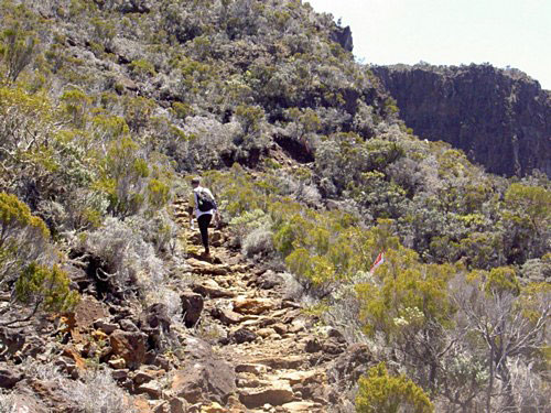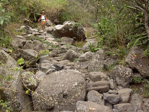Der Weg schlängelte sich in Serpentinen abwärts, war zwar steil, aber nicht schlecht, man konnte ihn gut gehen, kein Vergleich mit dem Abstieg nach Cilaos. Auch war er vor kurzem wohl frisch gerichtet worden. Wenn die Stufen nur nicht so hoch gewesen wären. So aber kosteten sie viel Kraft und richtig springen konnte ich nicht, da wären meine Oberschenkel nach kurzer Zeit ruiniert gewesen.