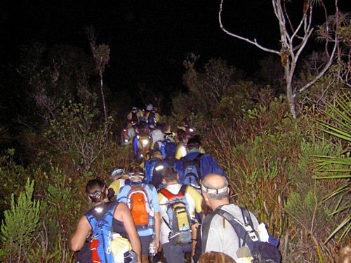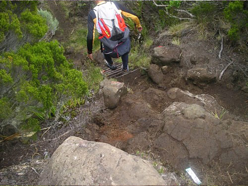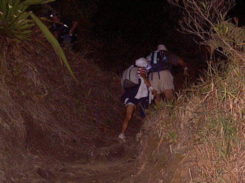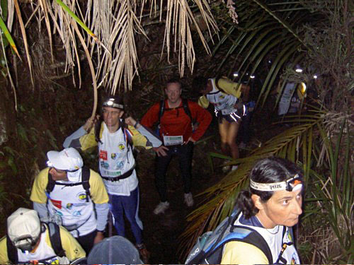 Laut Unterlagen ging es jetzt weitere 500 m hoch auf 1.513m bis zum Piton Bâtard und das Höhendiagramm zeigte, dass der Aufstieg noch steiler sein würde. Vor 53 Stunden hatte das Rennen begonnen, auf den Beinen aber war ich schon seit 71 Stunden und hatte in dieser Zeit etwa fünf Stunden geschlafen. Bleierne Müdigkeit überkam mich, so dass ich mich vor dem Aufstieg auf einen Stein setzte und vielleicht 15 Minuten döste.