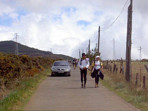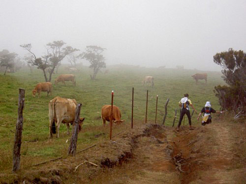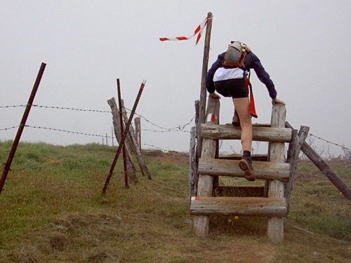 Unser Weg war links und rechts durch Stacheldrahtzaun abgegrenzt, hinter dem Kühe weideten. Immer wieder musste man einen Zaun auf Leitern übersteigen. Der Untergrund war recht anspruchsvoll, zwar immer noch Wiese, aber der Weg war ausgetreten und stellenweise richtiggehend ausgewaschen, sehr uneben und immer wieder waren auch Wurzeln im Weg.