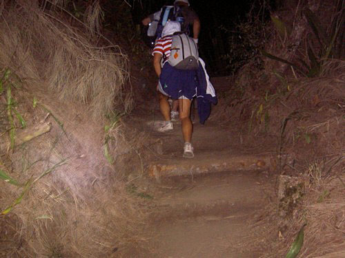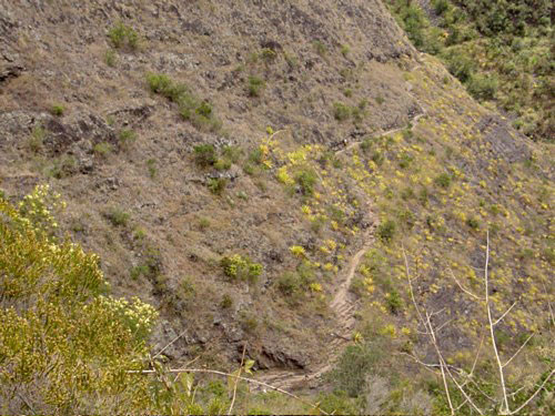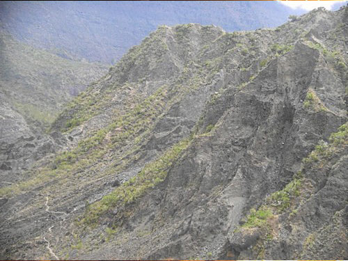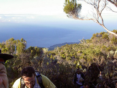 Es dämmerte bereits, als wir uns (Holm und ich) an den Abstieg hinunter nach Cilaos machten. Beängstigend steil fiel die Wand ab, die wir ganze 800 Höhenmeter abwärts überwinden mussten. Zum Glück war sie mit Büschen und Bäumen bewachsen, so dass man nie den direkten Blick nach unten hatte. Steil schlängelte sich der Pfad in vielen engen Serpentinen abwärts. Stellenweise war es so steil, dass ich nur weiter kam, wenn ich mich auf den Hosenboden setzte, mit den Füßen nach unten tastete und mit den Armen unterstützte. Immer wieder auch waren Eisenleitern im Fels befestigt, die man abwärts klettern musste, bis man wieder auf dem Pfad war. Beinahe drei Stunden dauerte der Abstieg, der all meine Kräfte und Konzentration forderte.