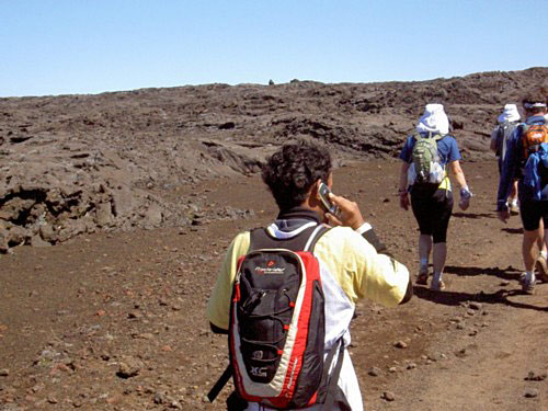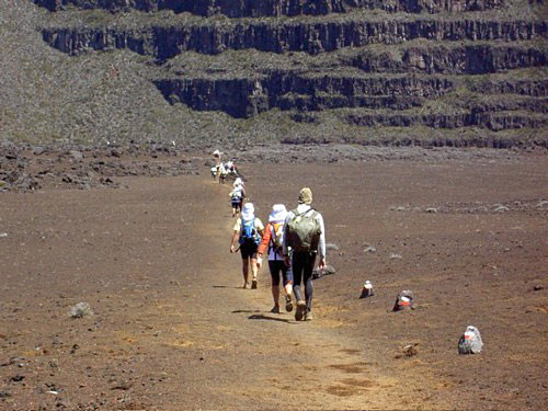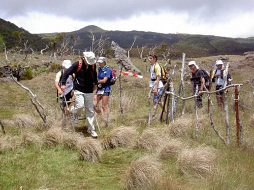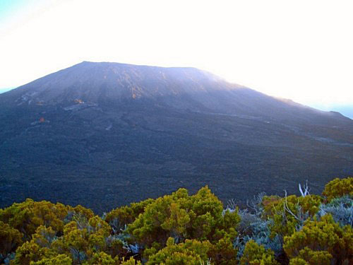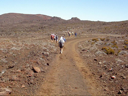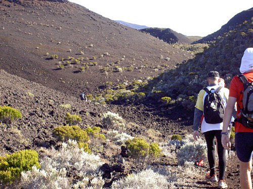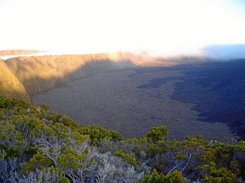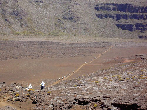 Der folgende Abschnitt war einfacher, kein Anstieg mehr, nur noch wenig auf und ab. Wir hatten bald den riesigen Krater erreicht, in dessen Mitte der noch aktive Vulkan „Piton De La Fournaise“ lag. Etwa alle 18 Monate gibt es eine Eruption; damit zählt dieser Vulkan zu den aktivsten der Welt. Dabei ist das Magma relativ dünnflüssig, kann daher gut entweichen und fließt dann in verästelten Strömen hangabwärts. Wenn es soweit ist, setzten sich Zehntausende ins Auto und fahren hoch, um das Erlebnis zu feiern.