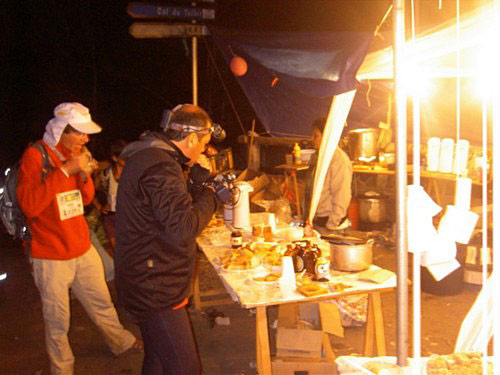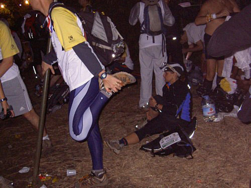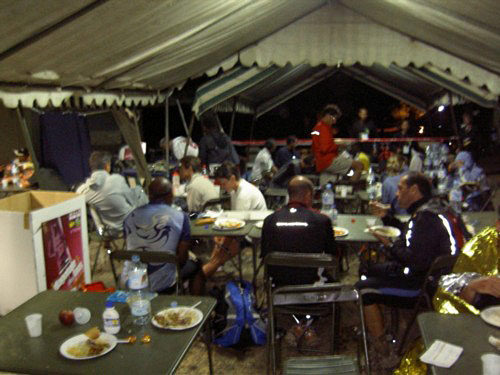 An dieser größeren Verpflegungsstation gab es das erste Mal auch die von Bernhard erwähnten Hähnchenteile mit Reis, Nudeln oder Brot, aber auch das übliche Wasser, Rosinen, Orangen, Riegel, Cola, Nudelsuppe war hier vorhanden.