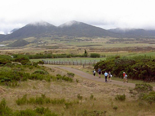Vielleicht 1,5 Stunden war ich hier unter widrigsten Bedingungen unterwegs, als der Untergrund zunehmend trockener und damit griffiger wurde und es auch nicht mehr so steil abwärts ging. Bald weitete sich der Blick, eine Wiese lag vor mir, weiter unten ein Weg, noch weiter unten die letzte Kontrollstation (Colorado) und ganz weit in der Ferne St. Denis und das Meer.