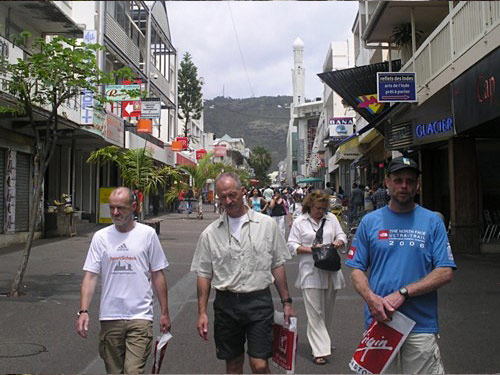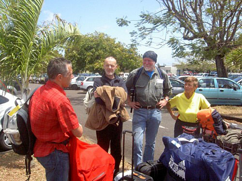 Nach 11 Stunden Flug (ca. 9.500 km) landeten wir am Dienstag, 17.10.2006 gegen 10 Uhr Ortszeit (+2 h Zeitverschiebung) auf dem Flugplatz von St. Denis, der Hauptstadt der Insel, im Norden gelegen. Wir, das waren Bernhard Sesterheim, Sigrid Eichner, Kunibert Schmitz, Holm Reinsch und Adrian Brennwald. Auf dem Flughafen noch empfing uns Pascal Hagenbach, der die Reise mit einer anderen Fluglinie gemacht hatte. Da der Flughafen direkt am Meer liegt, hatten wir schon beim Anflug und bald auch im Freien den richtigen Eindruck von der Insel: blaues Meer, blauer Himmel, blühende Pflanzen, angenehme Wärme – wir waren vom Herbst in den Frühling geflogen.