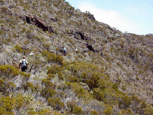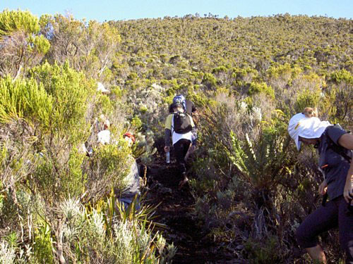 Bald lag die Plaine hinter uns und hohes Buschwerk umgab uns jetzt. Immer wieder ging es steil hoch, leider aber auch immer wieder steil abwärts. Endlich, nach beinahe vier Stunden hatten wir unser Ziel erreicht.