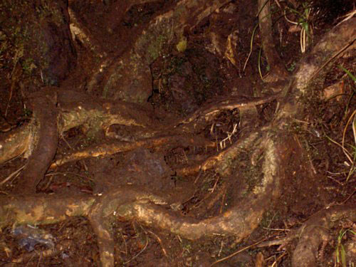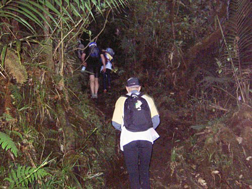 Nach etwa fünf Minuten Aufenthalt gingen wir zügig weiter. Bald ging es rechts weg in einen schmalen Pfad, steil aufwärts. Hier also begann der berüchtigte Aufstieg hoch zum FocFoc: 5 km und 1.400 Höhenmeter. Der Pfad führte hoch durch Wald, besser Urwald, der Untergrund war teilweise rutschig und von groben Wurzeln übersät. Steil, rutschig und Wurzeln, zu so etwas braucht man Kraft und manchmal auch die Hände, die mithelfen mussten.