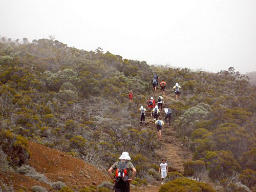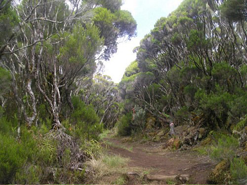 Nach etwa 1,5 Stunden Aufstieg wurde es immer lichter um mich herum und bald hatte ich einen Berggrat erreicht, insgesamt vielleicht zwei Meter breit, rechts und links steil abfallend, was aber nicht so sichtbar wurde, weil alles dicht mit niedrigen Büschen bewachsen war. Der Pfad selbst, auf dem man lief, war vielleicht vierzig oder fünfzig Zentimeter breit. Etwa eine Stunde lang ging es in ständigem Auf und Ab den Grat entlang. Hier oben in den Wolken legte ich mich auf den Boden um noch mal kurz zu schlafen. Nach etwa 20 Minuten wachte ich auf, war erfrischt und erfreut, dass mir nicht kalt war.