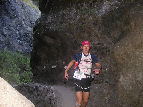 Ich rannte also los, vergaß jegliche Vorsicht und Rücksicht auf meine Kondition. Zuerst ging es anstrengende Stufen hinunter. Der folgende, einigermaßen gut zu laufende Pfad schlängelte sich dann 650 Meter den kahlen Hang hinunter bis zum Fluss im Talgrund. Auf einer Brücke ging es über das Wasser und wieder 300 m steil hoch, bis ich dann, völlig erschöpft und 45 Minuten zu spät an der nächsten Kontrollstelle ankam.
