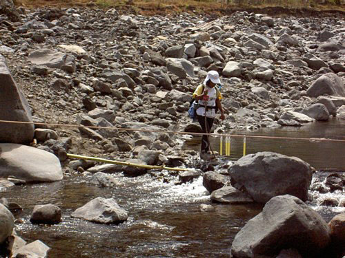 Diese Kontrollstelle lag beinahe idyllisch am Flussbett. Ich trank Cola, füllte meinen Wasservorrat auf und lief dann weiter. Der Übergang über den Fluss war mit einem Seil gesichert, der Fluss aber führte so wenig Wasser, dass es keine große Mühe machte, von Stein zu Stein hüpfend, das andere Ufer zu erreichen.