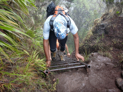 Das nächste Teilziel des Grand Raid lautet Caverne Dufour, auf dem Weg zum Piton des Neiges, mit 3.070 Metern der höchste Berg der Insel. Bis auf wenige Ausnahmen ist wieder „Klettern“ angesagt. Nicht ganz so steile, dafür aber lange, zermürbende Anstiege warten auf uns. Da es immer noch regnet, sind die Pfade aufgeweicht. Das Vorwärtskommen ist mühsam. Plötzlich bildet sich wieder ein Stau. Nach einigen Minuten ungeduldigen Wartens erkenne ich auch warum. Es geht senkrecht den Berg hinunter!! Mit Hilfe von Leitern steige ich 5-6 Meter in die Tiefe. Über spitze, rutschige Felsen bewege ich mich weiter Schritt für Schritt vorwärts.