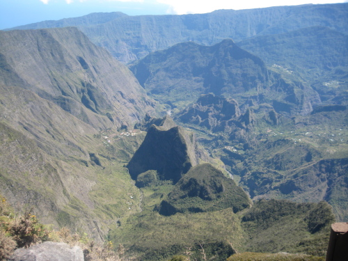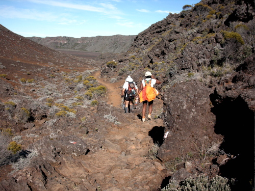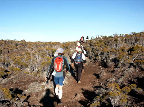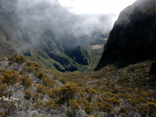 Es ist mittlerweile richtig frisch geworden. Durch die hinzukommende Nässe fange ich an zu frieren. Ich zittere am ganzen Leib! Nichts wie weiter. Mittlerweile haben wir den Cirque de Mafate, einen der drei Bergkessel der Insel, betreten. Keine einzige Strasse führt hier hinein. Die wenigen Einwohner des Cirques werden aus der Luft mit dem Hubschrauber versorgt. Ein bizarres System aus Schluchten, Plateaus und Steilwänden durchzieht diese wilde Landschaft. Die Mafate ist von tiefen Gräben zerfurcht und im Zentrum weitestgehend unzugänglich. Doch erst bei Tageslicht erschließt sich mir die Schönheit dieser Gegend. Ich treffe wieder Bernie, der sich in Marla etwas kürzer aufgehalten hat als ich. Die nächsten Kontrollpunkte Roche Plate und Grand Place passieren wir ohne größere Probleme. Die Strecke führt ständig bergauf und danach wieder bergab. Die aufkommende Hitze macht uns beiden schwer zu schaffen. Die Sonne scheint immer kräftiger und sorgt für Temperaturen um die 30 Grad Celsius. Besonders bei den steilen Anstiegen kommen wir nur ganz langsam voran.