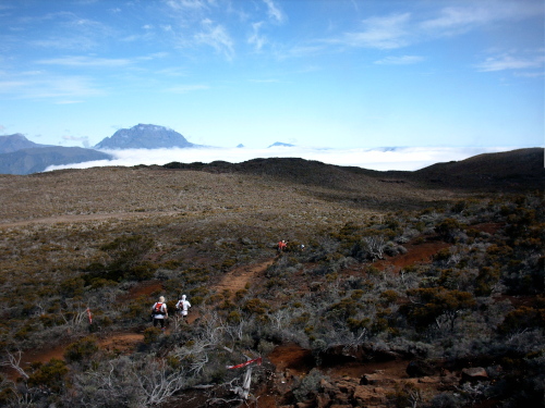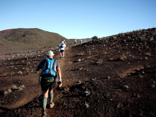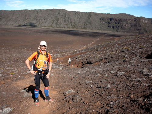 Kurz nach fünf Uhr wird es langsam wieder hell. Bis zum Gipfel habe ich es nicht mehr weit. Bei Kilometer 23,7 ist der Verpflegungspunkt Foc-Foc am Rande des Vulkans Piton de la Fournaise erreicht. Dieser zählt zu den aktivsten Vulkanen der Welt. Alle 18 Monate bricht er im Schnitt aus. Die Umgebung hier oben präsentiert sich, fast ohne Vegetation, als wahre Mondlandschaft. Vorbei an scharfkantigen Lavaplatten und durch knirschenden Lavasand passiere ich die Plaine des Sables, eine riesig anmutende Sandwüste. Der Boden hier ist so porös, dass Regenwasser sofort versickert und erst weit entfernt im Canyon des Riviere de l’Est wieder austritt. Ich treffe hier meinen Lauffreund Bernie wieder. Wir genießen diese einzigartige Landschaft in vollen Zügen.