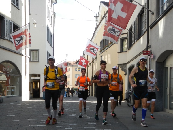 Entgegen der vergangene Woche verbreiteten Prognosen zeigt sich das Wetter von seiner Sonnenseite und bringt uns beim Lauf durch und aus der ältesten Stadt der Schweiz heraus einige Zuschauer. Leute sitzen in den Straßencafés und lassen den kurzen Spuk an sich vorbeiziehen, eine Kellnerin balanciert ganz mutig eine Tasse Kaffee quer durch das Läuferfeld und ich habe mittlerweile einen neuen Akku in die Kamera geschoben. Wenn nur ich nicht im gleichen Stil von einem Moment auf den anderen schlapp mache.