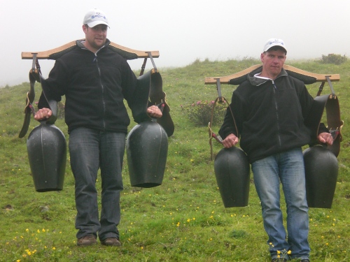 Mit der Passhöhe von Foppa ändert sich nicht nur das Streckenprofil, sondern erweitert sich auch unser Blickfeld. Leichten Fußes eilen wir auf gut ausgebauten Wegen hinab. Immer mehr geben die Wolken den Blick auf die uns umgebende Landschaft frei, auf ein wogendes Meer weiter Wiesen mit eingestreuten Almhütten, umrahmt von Nadelbaumgehölzen. Nur die entfernteren Berge, die sehen wir weiterhin nicht. Für besondere Abwechslung sorgt zwischendurch ein relativ steil bergab führender, schlammiger Trampelpfad, der durch die Wiesen und ein urwaldartig eingewachsenes Waldstück führt. Man muss schon ein wenig aufpassen, hier nicht auszurutschen oder umzuknicken. Andererseits macht mir gerade diese urwüchsige Trail besonderen Spaß.