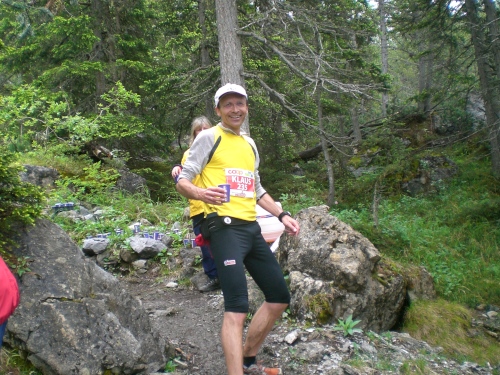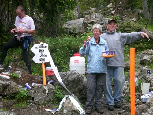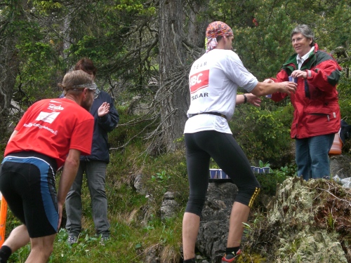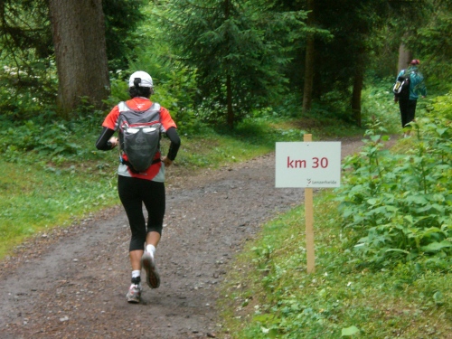 Weiterhin auf flachem Terrain nähern wir uns auf Waldwegen dem nächsten Etappenziel: Lenzerheide. Der Wald öffnet sich erst unmittelbar am Ortsrand. Keine Minute später erreichen wir bei km 30,7 das Start-/ Zielgelände aller anderen Läufe mit dem Festzelt. Ein „Speaker“ begrüßt lautstark die Ankömmlinge. Unterhalb eines großen Einlaufbogens wird für die 20 Meilen-Läufer die Endzeit und für die Marathons die Zwischenzeit genommen.