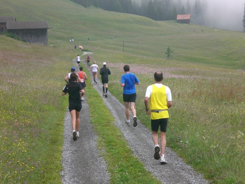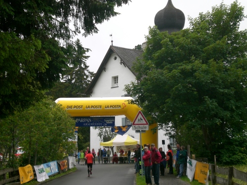 Der Streckenverlauf wird zunehmend flacher und mutiert zum gemütlichen Landschaftslauf. Am Horizont taucht bei km 24 schließlich der Kirchturm von Parpan (1.509 m ü NN) auf. Am Ortseingang werden wir von einigen applaudierenden Zuschauern erwartet und per Lautsprecher namentlich begrüßt. Nur wenige hundert Meter weiter tauchen wir jedoch schon wieder ein in die Stille der Natur.