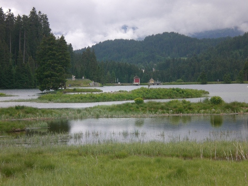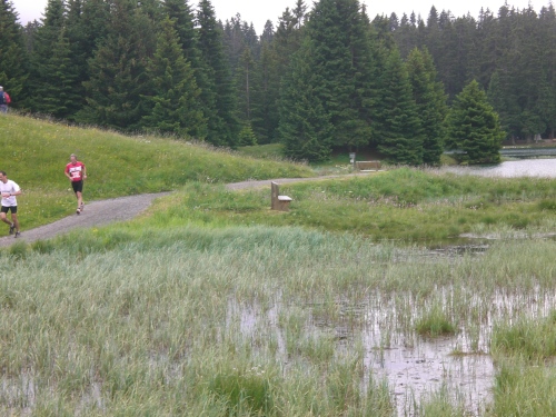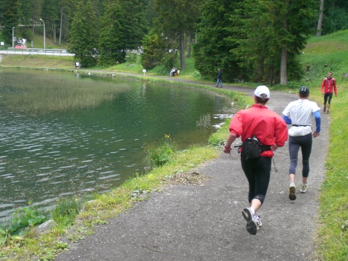Auch wenn die oberen Regionen der umgebenden Berge, unter anderem das Rothorn, von Wolken verhüllt sind und die Sonne keinerlei Chance hat durchzubrechen, präsentiert sich uns der Heidsee als echtes Postkartenidyll. Der Marathonkurs führt auf einem Naturweg knapp 3 km fast um den gesamten See herum. Gleich am Anfang erleben wir ihn von seiner schönsten Seite, und zwar dort, wo See und Umland unter Naturschutz stehen. Verwinkelte Buchten, verschilfte kleine Inseln, sumpfige Wiesen, dazwischen Gruppen dunkler Nadelbäume prägen das Bild. Fast schon in eine skandinavische Wildnis fühle ich mich versetzt. Auch naturnah, aber dennoch ganz anders ist der Charakter der gegenüberliegenden Seeseite: Hier sind Bade- und Grillplätze, Strandlokale, hier kann man segeln und surfen, und hier sind auch sehr viel mehr Besucher unterwegs, die der dahin tröpfelnde Läuferstrom umkurven muss.