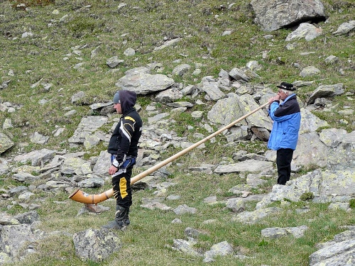 Der weitere Weg führt um einen Bergvorsprung. Das 40-Kilometerschild folgt. Pia lässt sich zu einem Kilometerschildbild motivieren. Das kriegt nicht jeder von mir! Weiter ansteigend. Ich höre Klänge aus einem Alphorn. Der Musiker lässt bei jedem Hochgebirgswanderer eine Weise erklingen.