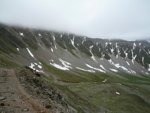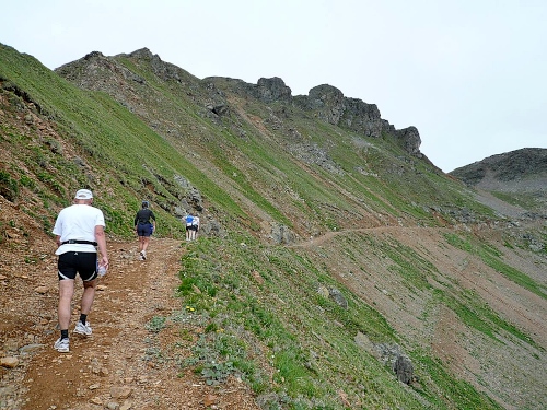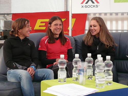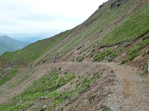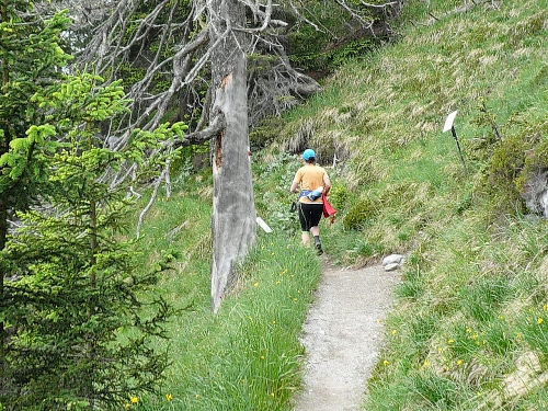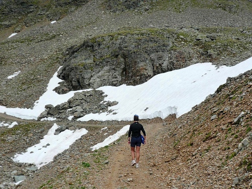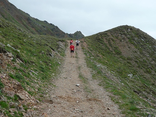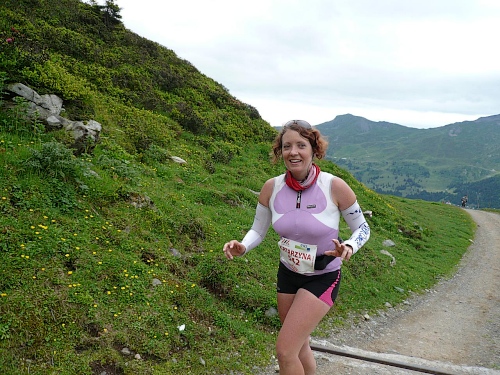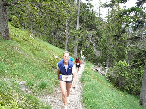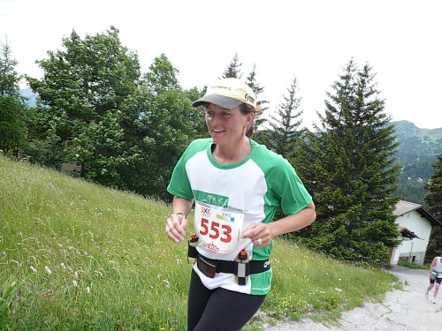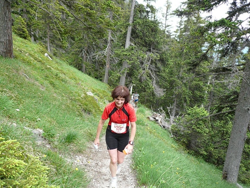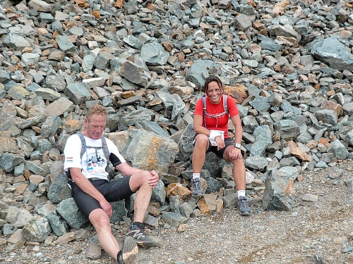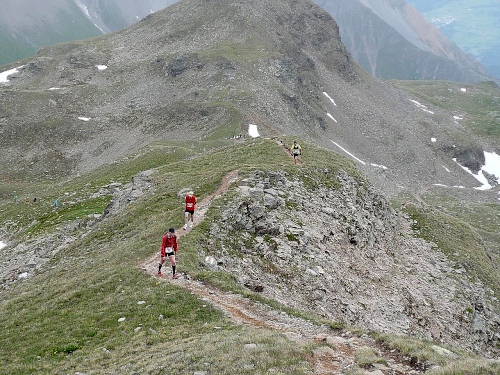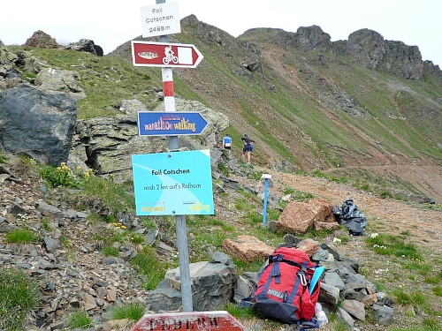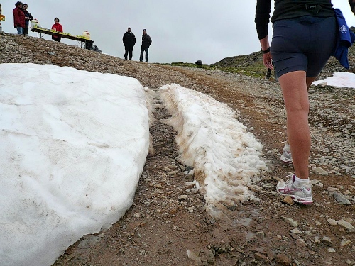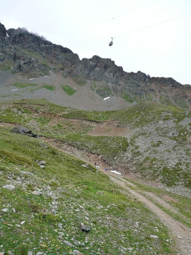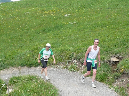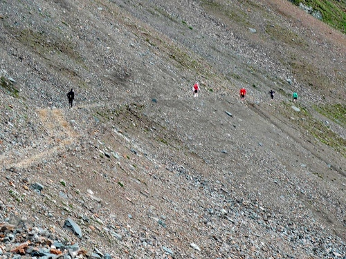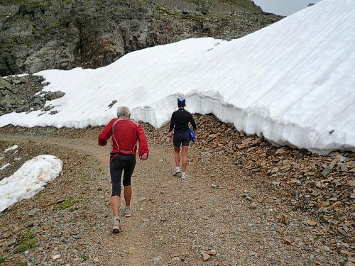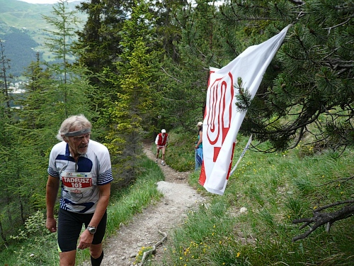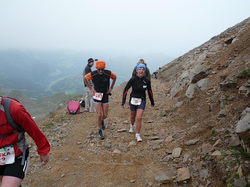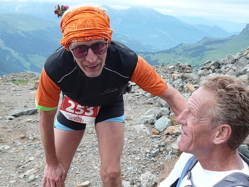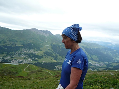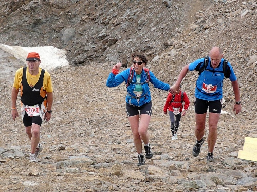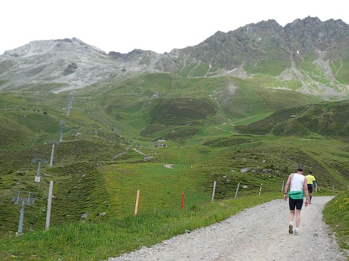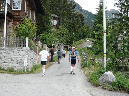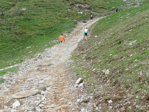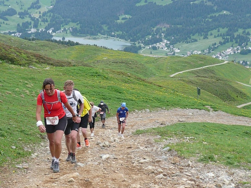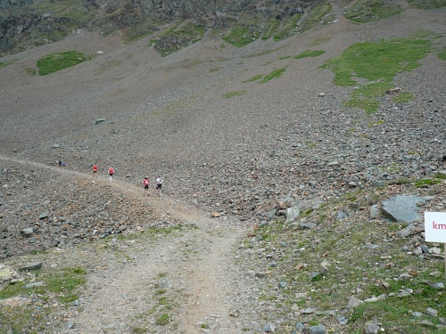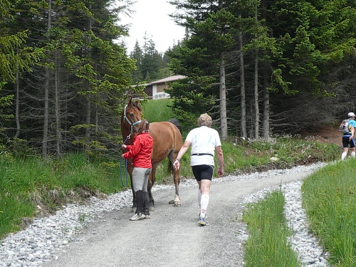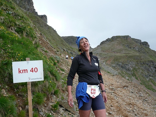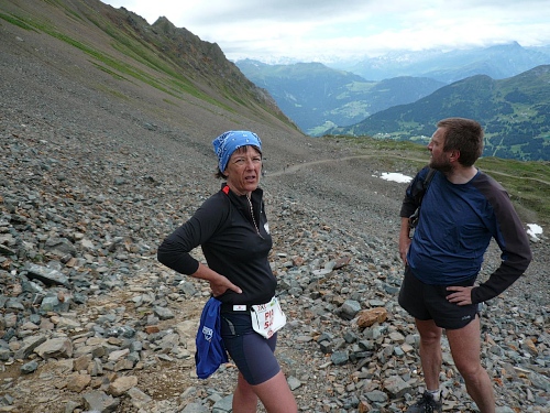 Am Weishornlift (2170 Meter, Kilometer 37,5) erhalten wir wieder Getränke. Zunächst sehen wir ergrünende Skipisten mit vielen Alpenblumen, dann wird das ganze steiniger. Der Fahrweg wird immer ruppiger. Nach Kilometerschild 38 folgt dann ein unglaublich schwieriger Streckenteil. Wir laufen unterhalb der Seilbahn durch die sogenannte Traverse. Mittlerweile will ich mich nicht mehr allein quälen und habe mich der Pia Rohner aus Rüti (Zürich) angeschlossen. Der Volksmund sagt, geteiltes Leid ist halbes Leid. Zu recht.
