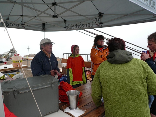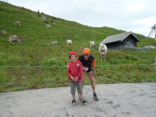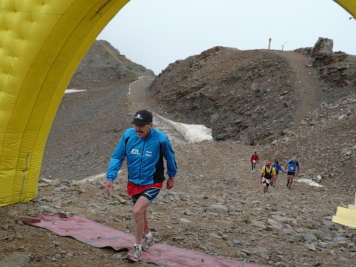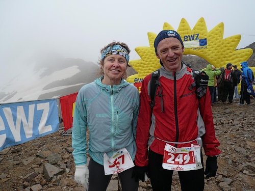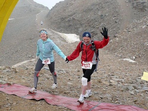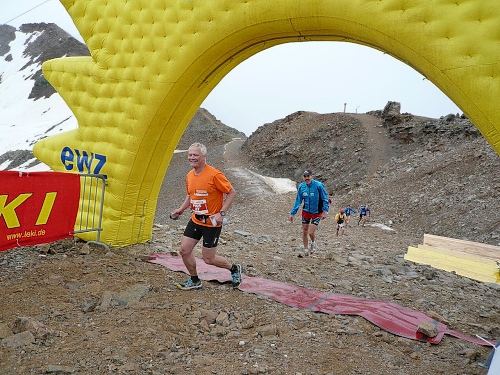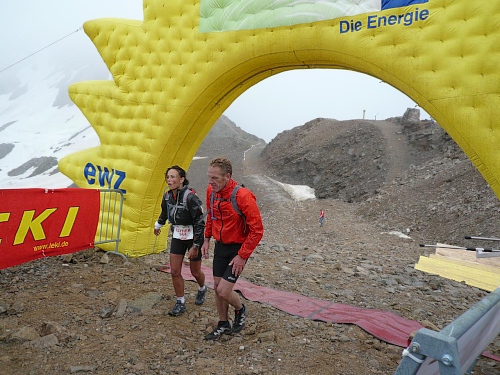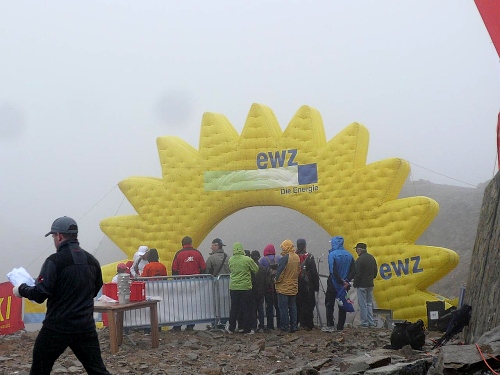 Die letzten Serpentinen. Von oben rufen Pias Angehörige, sie kommen uns entgegen zum Anschieben. Weitere Zuschauer hocken wie die Hühner „aufm Stangerl“. Mittlerweile bläst der Wind unangenehm kalt. Da ist man froh, wenn man ein paar Meter im Windschatten unterwegs ist. Und es fängt zu regnen an. Oder ist’s Graupel? Hölle pur, wo ist denn jetzt die Bergstation? Die ist nicht zu sehen. Ich fluche innerlich. „Wie weit geht es denn noch“, fragt Pia fast verzweifelt. „Nur noch um die Bergecke da“, höre ich von einem Betreuer. Und dann sehen wir den Himmel. Das Ziel - vielleicht 50 Meter weg. Wir marschieren stramm und laufen die letzten Meter ins Ziel auf 2865 Meter Höhe, dem Rothorn. Dem Himmel sei Dank. Die hart verdiente Medaille wird überreicht.
