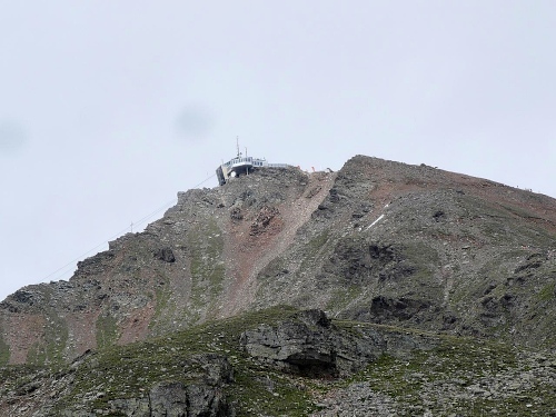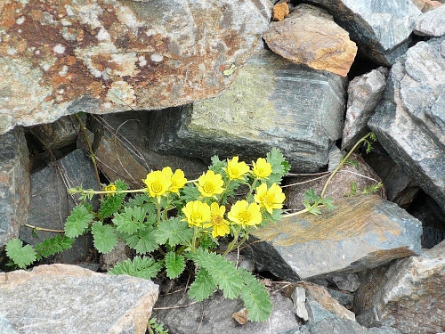 Man glaubt, in einer Steinwüste zu sein. Und zwischen den Steinen finden sich immer noch kleine Blumen, die das Mikroklima ausnutzen können. Das Herz hämmert, die Luft ist knapp. Wer seine maximale Herzfrequenz sucht, kann hier sicher fündig werden. Ich habe Arbeit, dass ich genug Luft bekomme. Ist das die Höhe? Irgendwie ist mir warm. Die Sonne ist durch die dünne Wolkendecke fast nicht sichtbar. Da kommt mir ein Gedanke und ich greife nach einem Stein am Weg. Er ist „bacherlwarm“. Aha, das mit der Wärme war nicht geträumt. Die diffuse Strahlung reicht, um den Untergrund ein wenig aufzuheizen.
