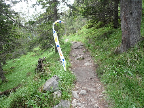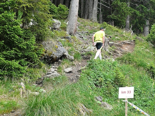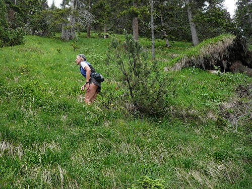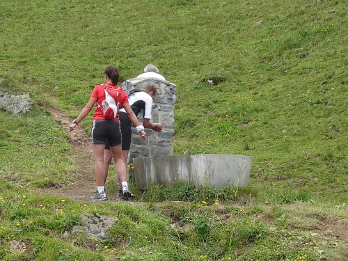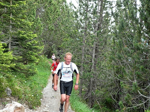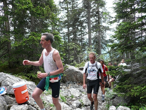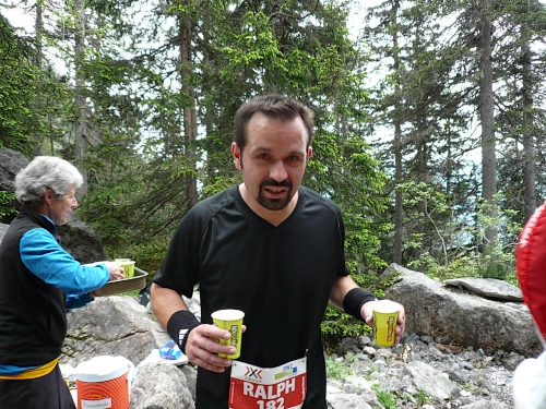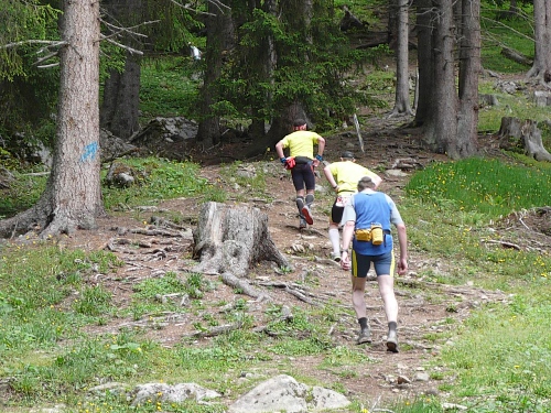 Vor der Verpflegung Wasserfall (Kilometer 33,5, 1800 Meter) kippe ich ein Isogetränk hinter die Binde und genehmige mir dazu eine kurze Sitzrast. Wer will, kann in eine Schale mit Salzstangen und Erdnüssen langen. Da eine kleine Kolonne Läufer daherkommt, werde ich unruhig und mache mich wieder auf den Weiterweg. Es folgt ein rund zwei Kilometer langer Singletrail ohne nennenswerte Steigungen. Es tut gut, dass ich wieder ins Joggen komme und so die Beine lockern kann. Doch aufgepasst wegen der Steine und Wurzeln. Ich überhole eine Holländerin, die hier bereits Schwierigkeiten beim Überwinden solcher Hindernisse hat. Vor der Mittelstation bearbeiten drei Burschen ihren Trycheln mit großer Inbrunst.