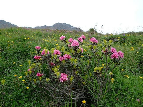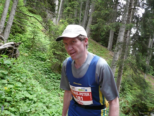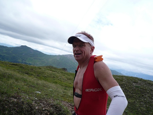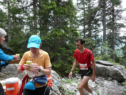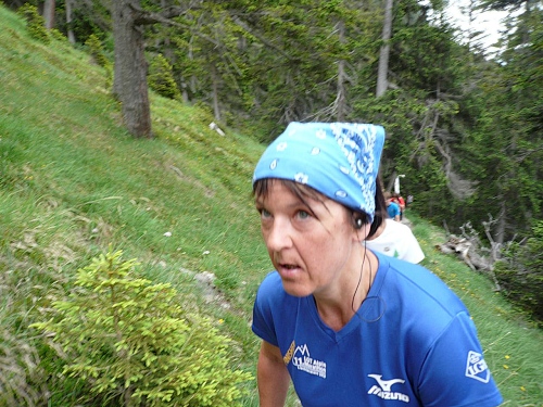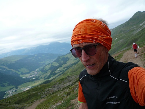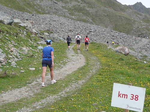 Kurz vor der Mittelstation pflücke ich mir ein paar Alpenrosen und stecke sie mit ins Stirnband. Ein Fotograf hat mich dabei ertappt. Bei der Mittelstation (Kilometer 35,4; 1883 Meter) ist der Verpflegungstisch wieder reichlich gedeckt. Ich greife zu. Dann geht’s auf guter Bergautobahn weiter, auch Laufeinlagen sind möglich, wer noch laufen kann. Für ein paar Meter geht es auch bei mir noch. Aber es wird übel schwer.
