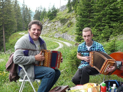 Es folgt das letzte Drittel, der Anstieg zum Rothorn. Auf gut elf Kilometer Weg sind noch rund 1400 Höhenmeter verteilt. Ich glaube, ich werde zum Spaziergänger, als ich von der Hauptstrasse links abbiege. Etwa auf halber Strecke zum Wasserfall haben sich zwei Musiker niedergelassen. Ein Lagerfeuer brennt, Essen und Trinken haben die auch dabei und spielen jetzt auf ihren Quetschen, die Schweizer nennen die Instrumente Handorgeln. Ich bin schon vorbei und jetzt auf einem schmalen Wanderweg, als mir einfällt, dass ich das Bierschnorren vergessen habe. Mist!