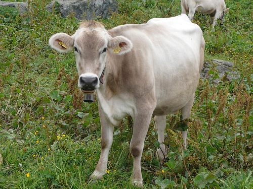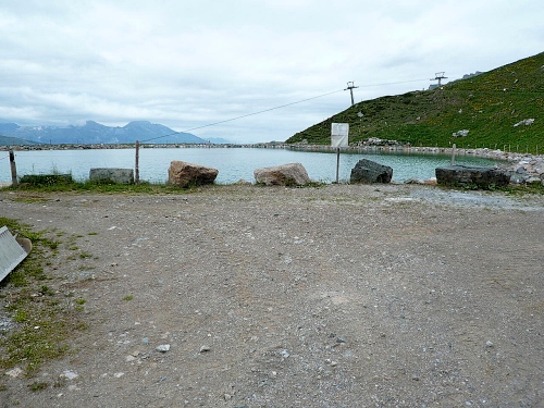 An der Alp Scharmoin ziehe ich mein Windjacke an, denn die Sonne ist wieder hinter den Wolken verschwunden. Die Alpbäuerin kommt herangelaufen. „Ein Bild mit der Kuh gefällig?“ fragt sie. Ich komm mir vor wie der Ochs (vorm Berg). Kurz danach sehen wir einen blauen Speichersee. Unsere Steigungsprozente werden wieder zweistellig. In meinen Oberschenkeln ist ein Höllenfeuer entbrannt, so sehr maulen die Muskeln.