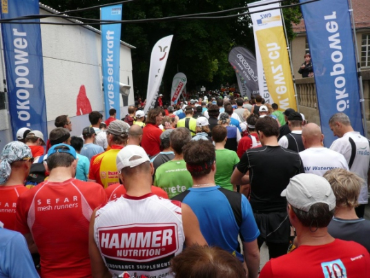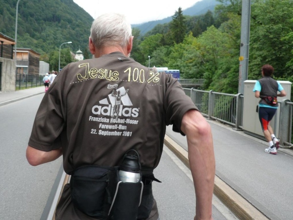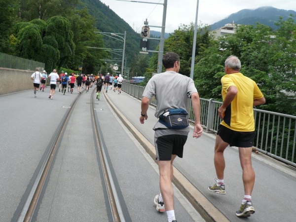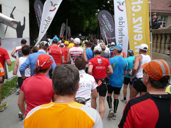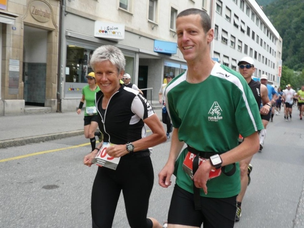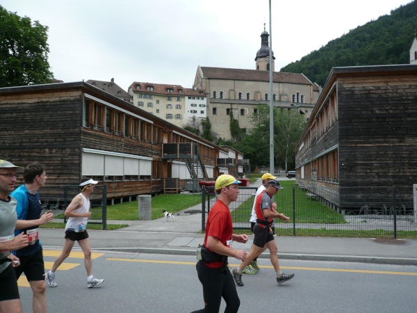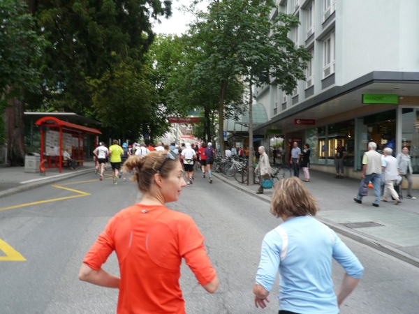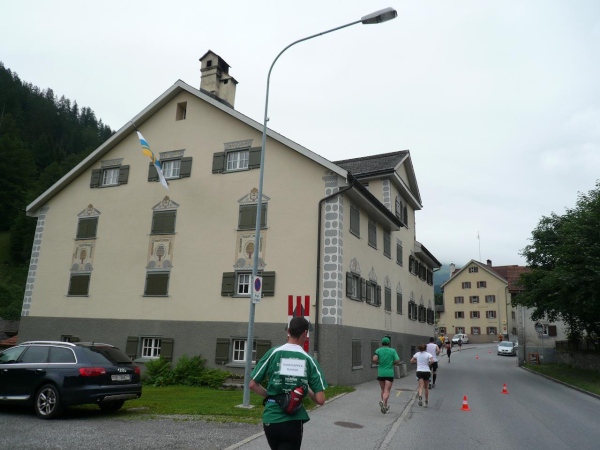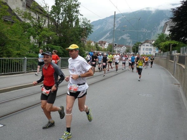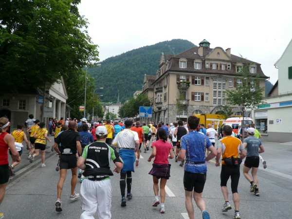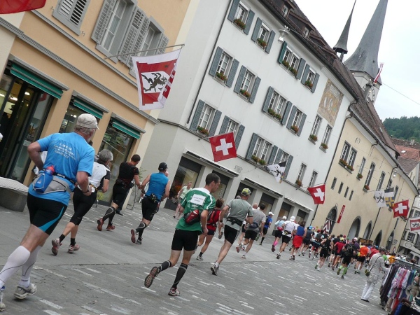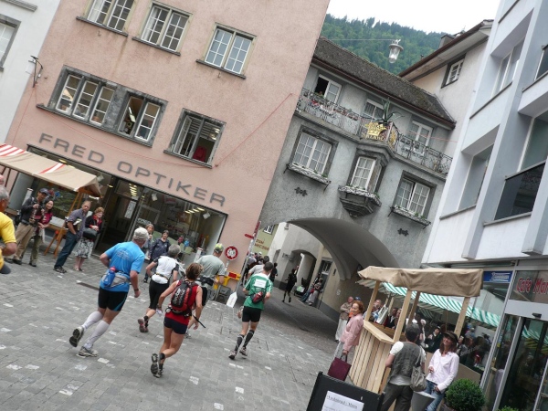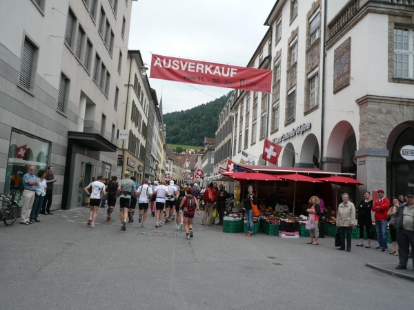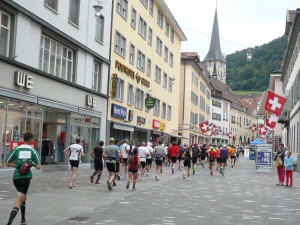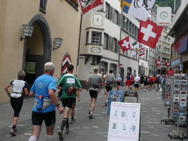 Wir stellen uns absichtlich im Startfeld hinten rein (wie die Griechen in den Strafraum), nicht dass wir uns aus den Augen verlieren. Die ersten Meter gehen um die Quaderwiese fast zur Hälfte herum und dann nach einem weiteren Stück geht es in die gute Stube von Chur: Die Altstadt um die Poststraße hat nicht nur heute ihr Festgewand an, denn wir sehen viele Zunft- und Bürgerhäuser mit Fahnen und Flaggen feierlich hergerichtet. Im oberen Teil wird an der Seite der Wochenmarkt abgehalten, der natürlich Kunden anzieht. Die wenigen Zuschauer geizen auch nicht mit Beifall.
