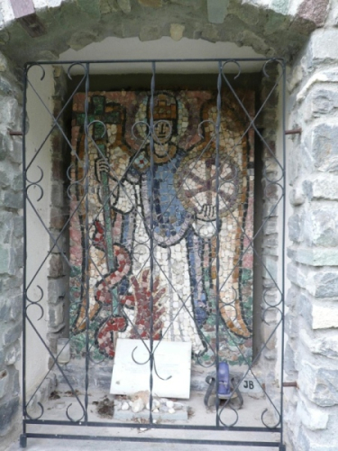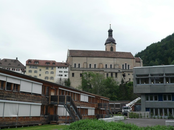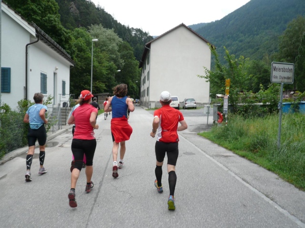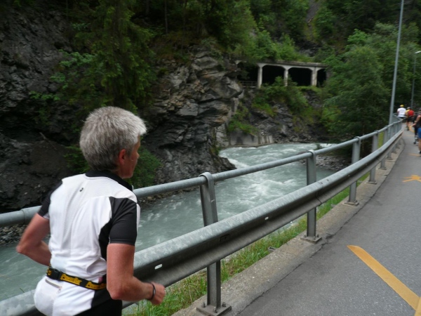 In Minutenschnelle verlassen wir die Altstadt und laufen entlang der Plessur auf einer Asphaltstraße. Rechts zweigt es zum Krematorium ab. Der dritte Kilometer liegt hinter uns, als wir die Zivilschutzanlage Meiersboden vor uns sehen. Die Hauptstraße nach Arosa (da braucht man im Winter oft die Schneeketten weiter oben, nicht wahr Klaus?) und die Rhätische Bahn sind jenseits des Gewässers und machen jetzt schon viele Höhenmeter.