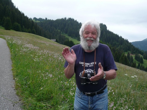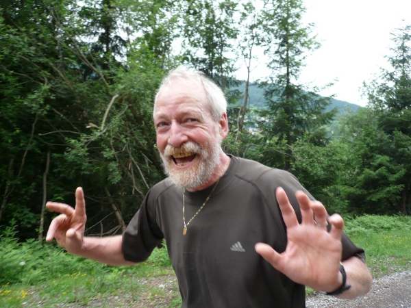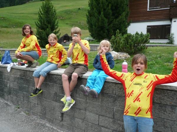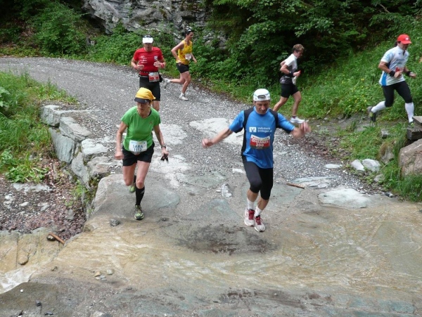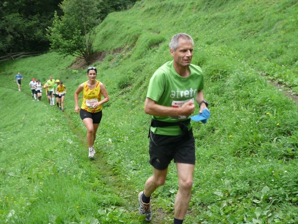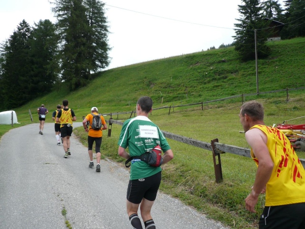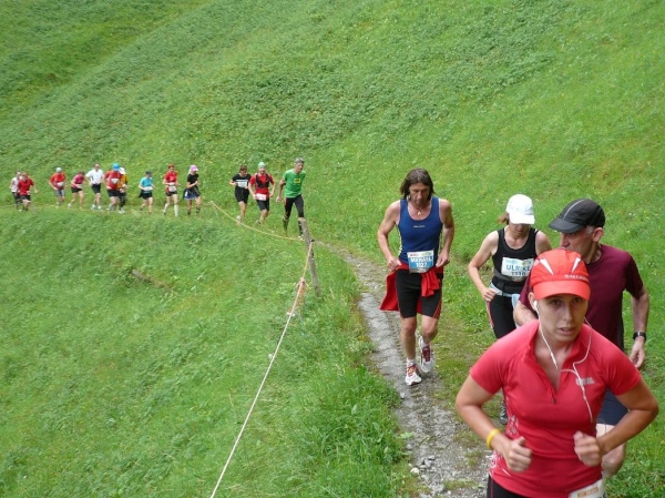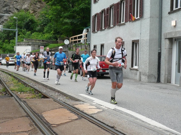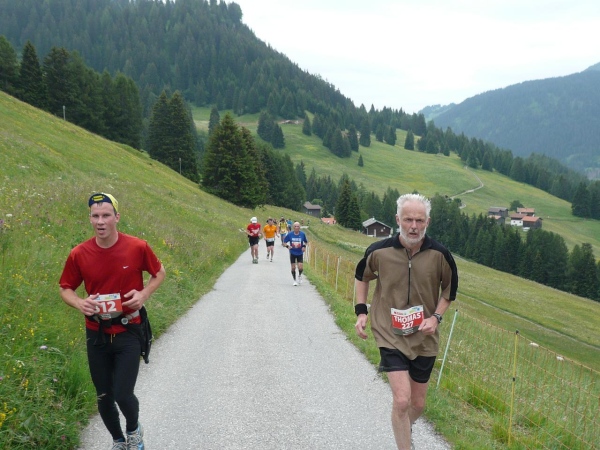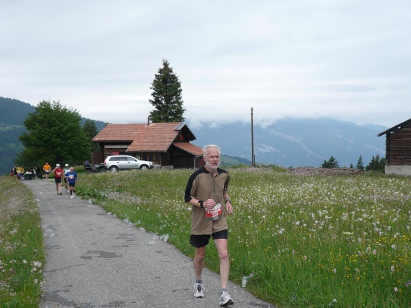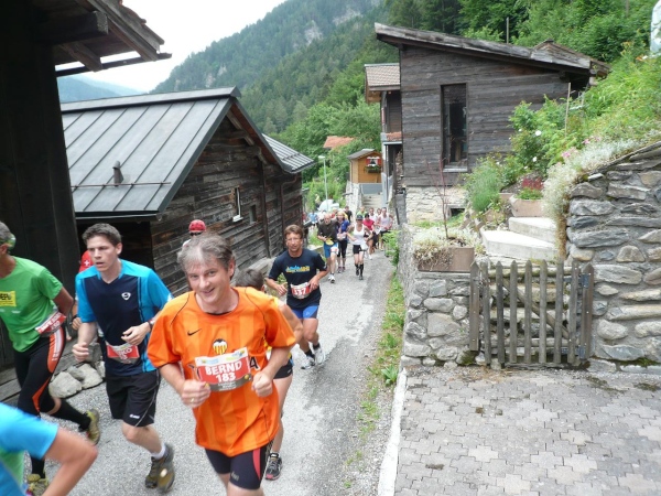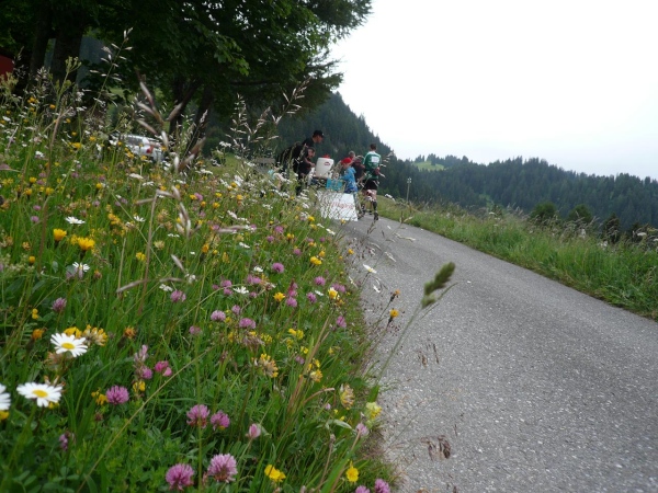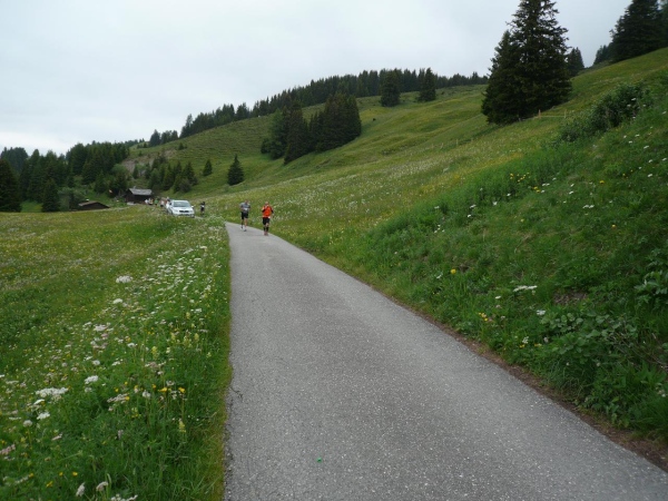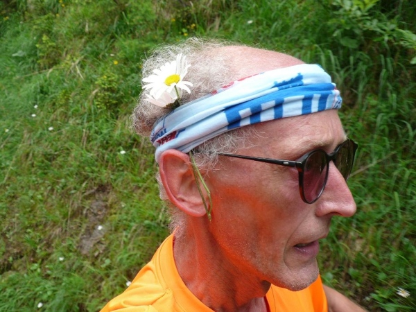 Während im Talbereich die Heuernte schon erledigt ist, blühen hier die Almwiesen in vielen Farben. Die Bilder können das nur zum Teil zeigen. Wirklich eine schöne Zeit, in die Berge zu gehen, wenn alles wieder zum Leben erweckt ist. Bis hinter Büel (weitere Verpflegung) haben wir guten Asphalt als Untergrund. Lachen muss ich, als ein einzelner Zuschauer mit seinem Rauschebart fast wie der Alm-Öhi ausschaut. Der aber ist mit Eifer dabei und klopft den einen oder anderen gar auf die Schulter. Dann reitet mich der Schalk, als ich mir zwei weiße Margeriten ins lockige Haar stecke.