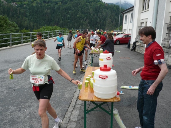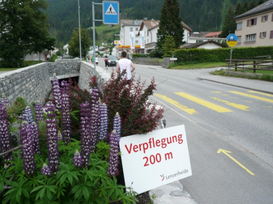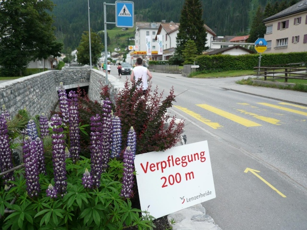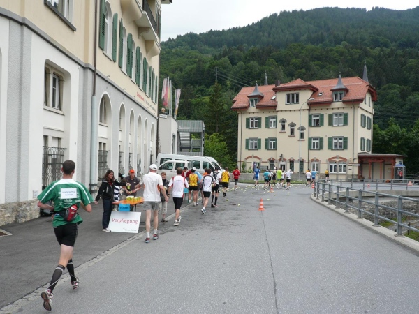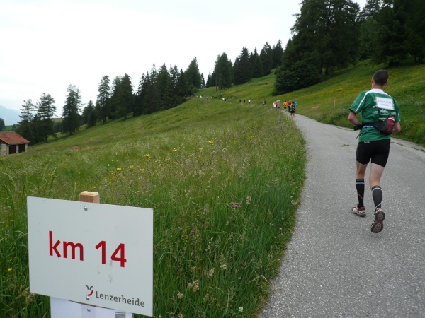 Kurz vor Kilometer 12 greifen die Bergläufer erneut eifrig zu. Wir verlassen die Hauptstraße und biegen nach links ab. Auf den nächsten gut fünf Kilometer warten 500 Höhenmeter auf ihr Bezwingen. Die erste lange Steigung von Chur herauf endet am Foppa Pass, wo wir uns dann auf 1754 Meter Seehöhe befinden.