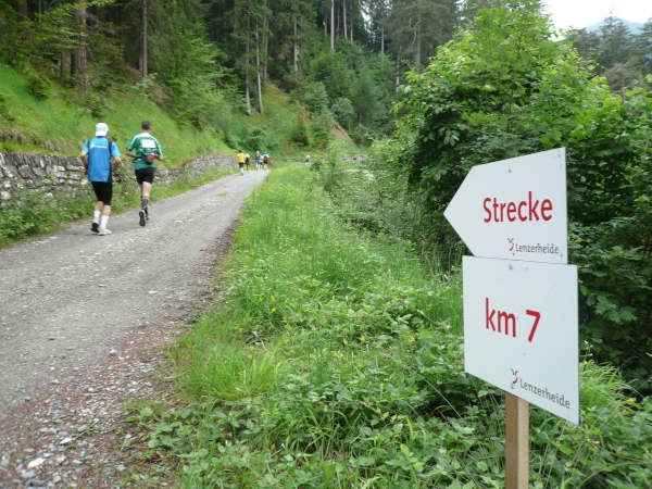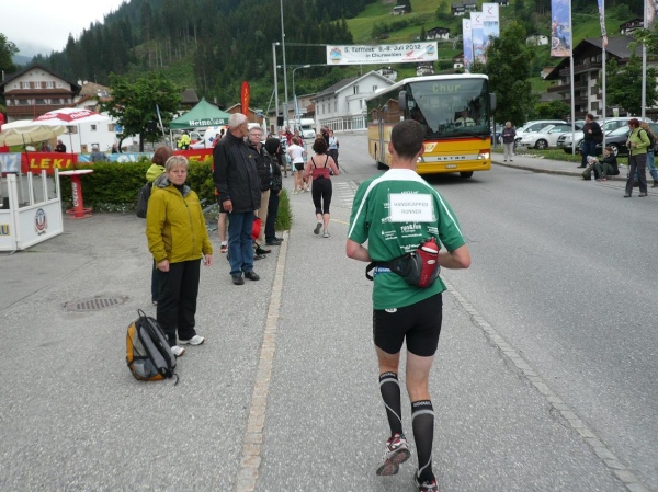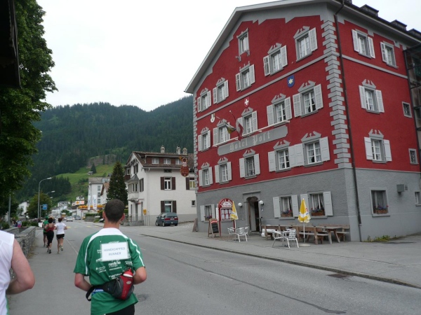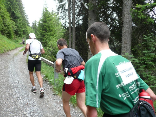 Auf den folgenden knapp zwei Kilometern wird das Lauftempo deutlich langsamer, denn bis zum Kurhaus Pasugg werden die ersten 200 Höhenmeter verbucht sein. Patric hat sich top ausgerüstet, denn auf seinen Rücken hängt jenes Schild, das Daniel vor zwei Jahren gebastelt hat. Unsere Lauffreunde können ein „Handicapped Runner“ lesen und sich so darauf einstellen.