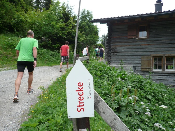 Nur leicht steigend führt uns die Strecke durch Bergwiesen und durch Bauernhöfe. Der Weg ist, auf bayrisch gesamt, kommod. Es würde fast in den Beinen jucken, hier Tempo zu machen. Lediglich am Ortsrand von Churwalden, wo dann der Polenwäg in die Hauptstraße zur Leinzerheide einmündet, wird der Anstieg nahrhafter. Patric läuft durch, ich muss immer wieder ein paar Schritte marschieren. Und dann wieder anlaufen, damit der Abstand zu ihm nicht zu groß wird.
