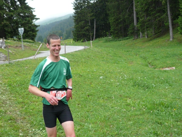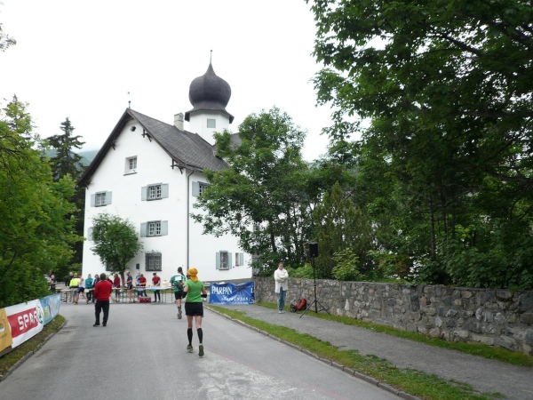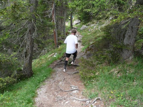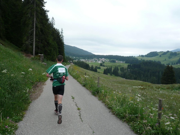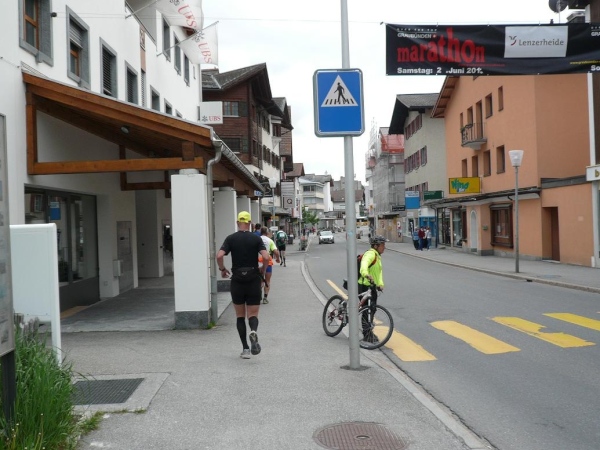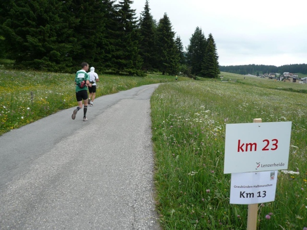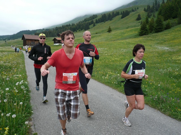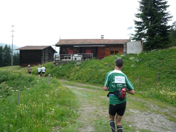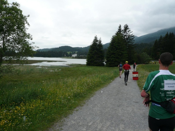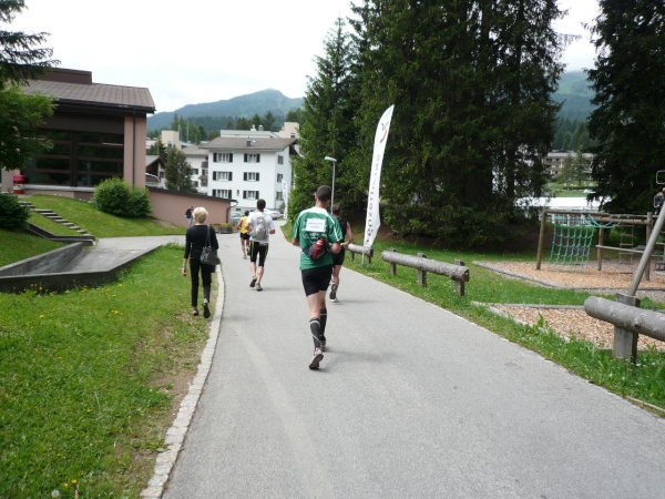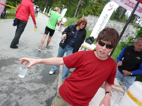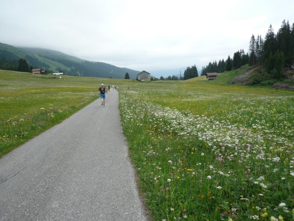 Eine weitere Tankstelle wird von freundlichen Helfern in Parpan (Kilometer 24,1, 1509 Meter) direkt neben der Kirche betrieben. Im folgenden Waldstück braucht es wieder Konzentration und Koordination, denn der Kurs wird crossartig über Wurzeln und Steine. Und wer seine heiß gelaufenen Haxen kühlen möchte, der kann ja in eines der zahlreichen Sumpflöcher steigen. Patric ist meist ein paar Meter voraus. Ich sehe, dass er hier keine Schwierigkeiten mit dem Boden hat.