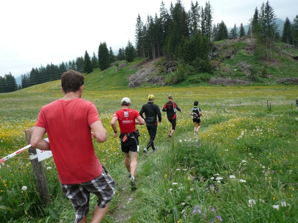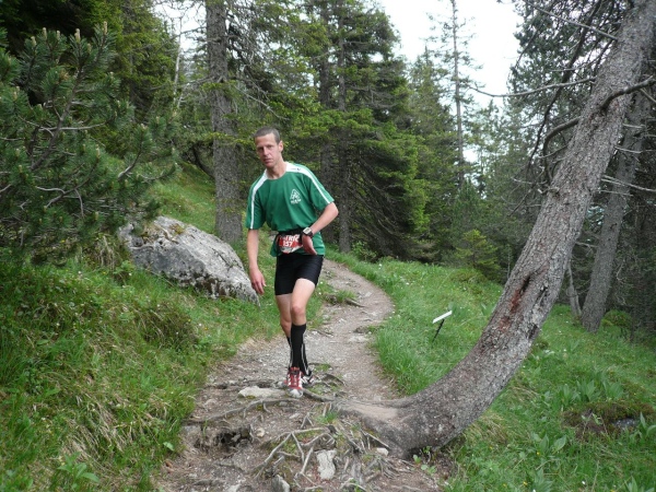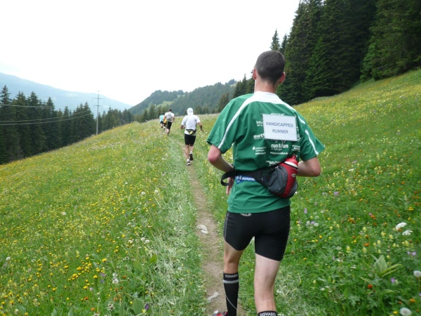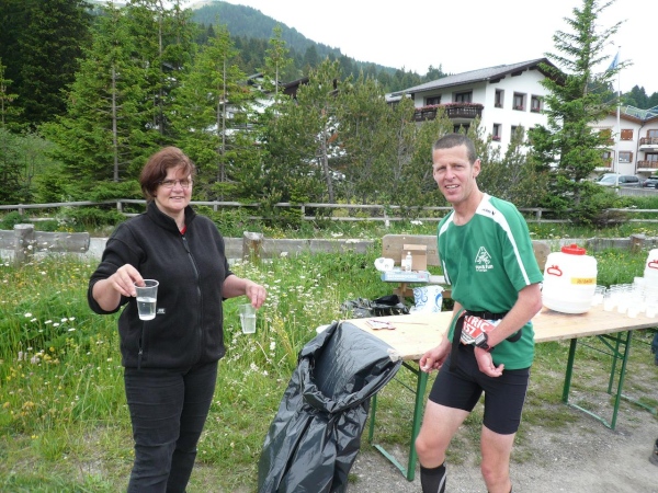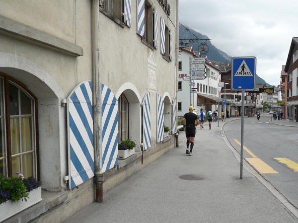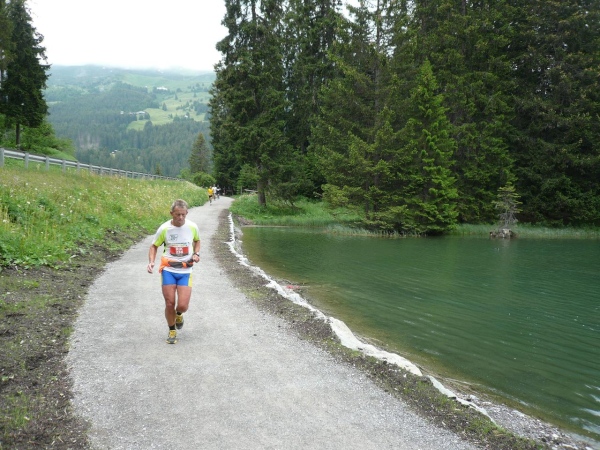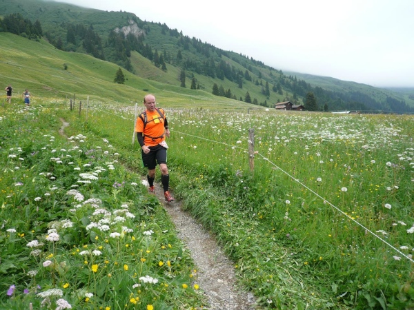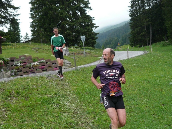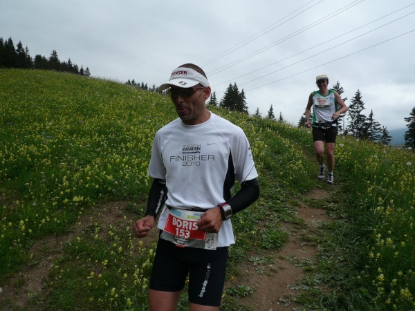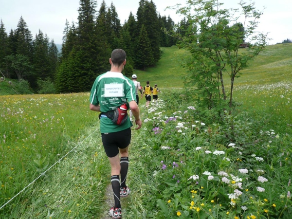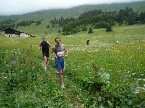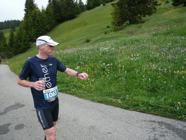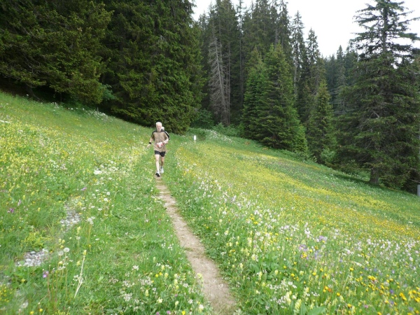 Eine weitere Tankstelle wird von freundlichen Helfern in Parpan (Kilometer 24,1, 1509 Meter) direkt neben der Kirche betrieben. Im folgenden Waldstück braucht es wieder Konzentration und Koordination, denn der Kurs wird crossartig über Wurzeln und Steine. Und wer seine heiß gelaufenen Haxen kühlen möchte, der kann ja in eines der zahlreichen Sumpflöcher steigen. Patric ist meist ein paar Meter voraus. Ich sehe, dass er hier keine Schwierigkeiten mit dem Boden hat.