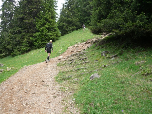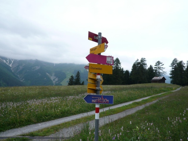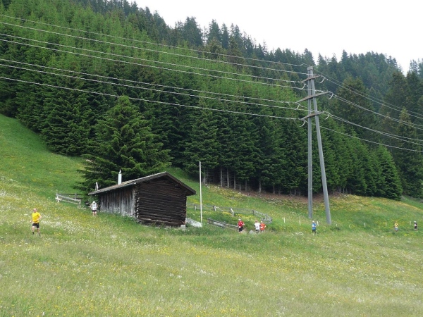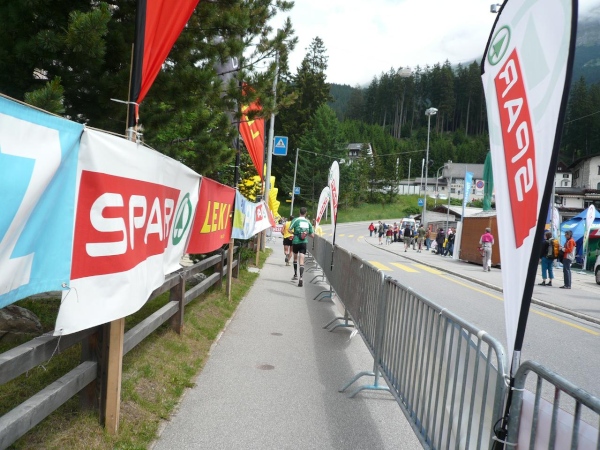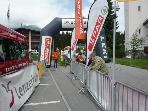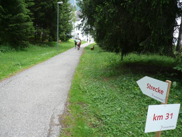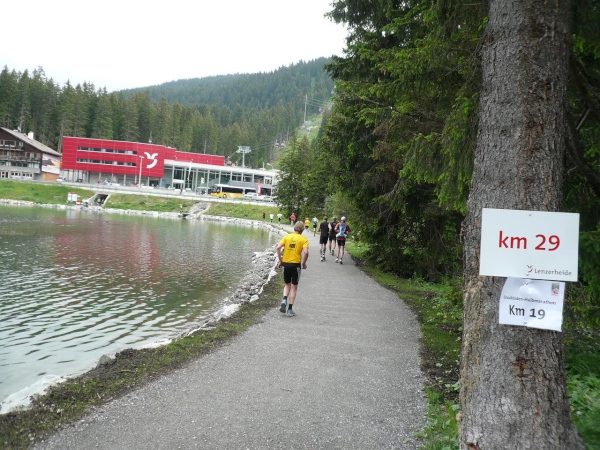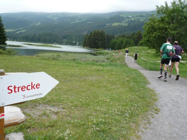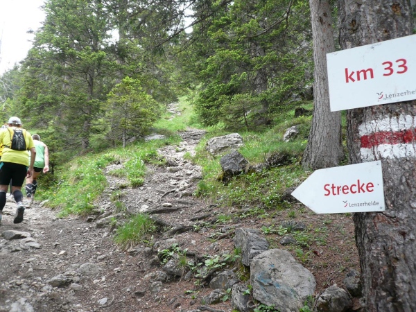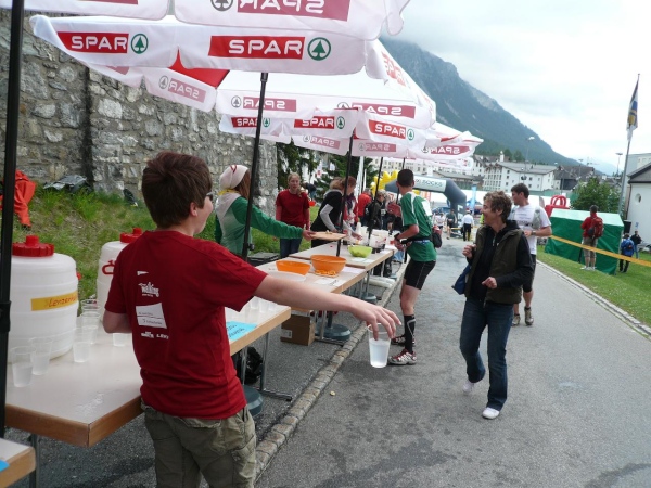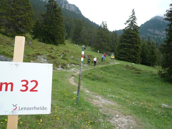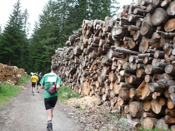 Im folgenden Waldstück sehen wir rechts einen frischen Haufen langer Holzstämme, knapp zehn Meter hoch. Danach wird der nächste Winter hart. Wir unterqueren abermals die Hauptstraße, es geht auf den kleinen Rundkurs durch das Schulgelände von Lenzerheide (1458 Meter, Kilometer 30,8). Die 20 Meilen-Läufer halten sich links und sind fertig, wir werden von einem Helfer rechts geleitet und können uns am folgenden Verpflegungstisch bedienen. Ich schlinge Bananen und Orangen hinunter, ein Becher Iso und Cola, zwei, drei Bilder und schon treibt Patric mich indirekt weiter, denn er ist schon wieder zehn Meter voraus. Ich hoffe, dass er an der Steigung zum Rothorn langsamer macht.