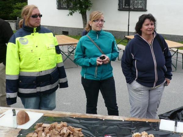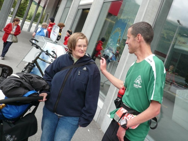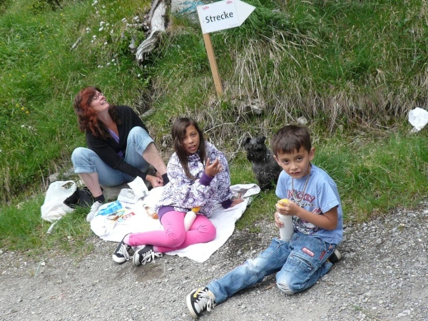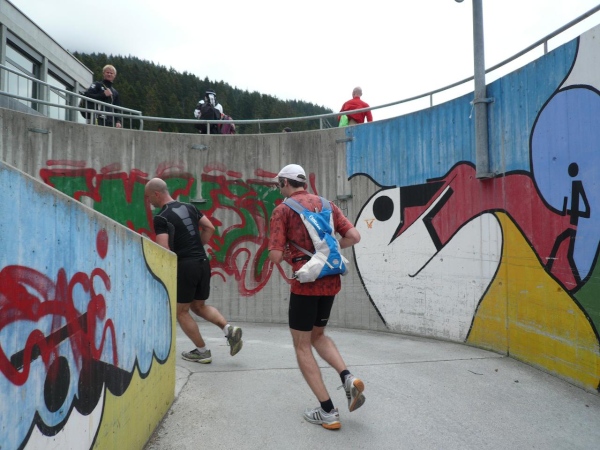 Als wir die Hauptstraße mit einer Rechtskurve verlassen, stehen wir fast am Berg, denn es reicht nur mehr für einige Meter joggen und ich muss dann marschieren. Und Patric, das Urvieh, sehe ich weiterhin im Laufschritt. Einen Zuschauer fordere ich auf, mich anzuschieben. Reaktionsschnell kommt seine Aussage: „Da oben is e Fördrband!“ Etwa auf halber Strecke zum Wasserfall haben sich zwei Musiker mit Handorgeln niedergelassen. Gerade ist Pause. Aber mein Gemaule hilft, denn dann spielen sie wieder.