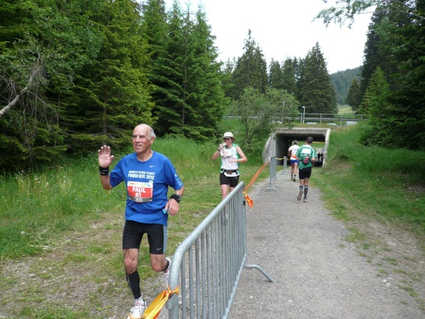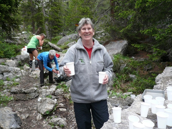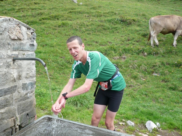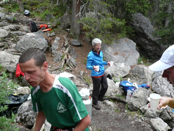 Bei der Tankstelle Wasserfall (Kilometer 33,5, 1800 Meter) sind wir schon 350 Höhenmeter über dem Talgrund. Wie schnell wird da Höhe gewonnen, Wahnsinn. Die Helfer sind eifrig und fragen gleich mehrmals, was der Läufer noch zum Schnabulieren braucht. Iso, Salzstangen und Erdnüsse wandern in meinen Bauch, der seit geraumer Zeit geknurrt hat. Also was hinein, denn einen Hungerast kann ich nicht gebrauchen.