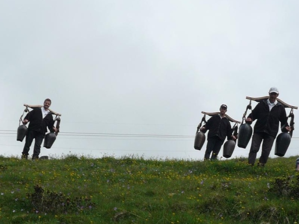 Zuerst leise, dann immer lauter hören wir die Töne von Trycheln. Später sehen wir drei Burschen, die ihre Instrumente mit Inbrunst bearbeiten. Die Mittelstation mit einer weiteren Tankstelle wartet.