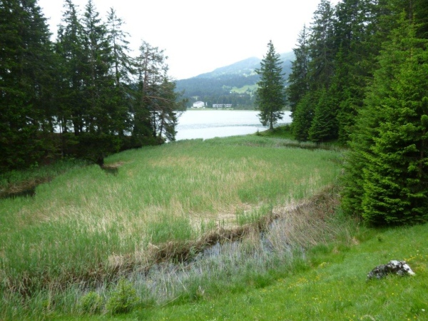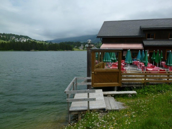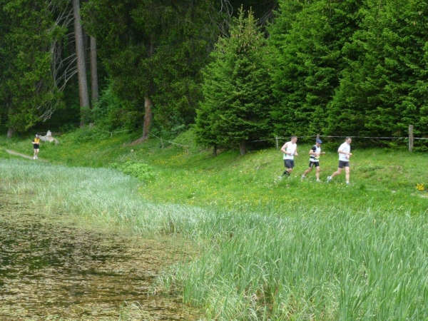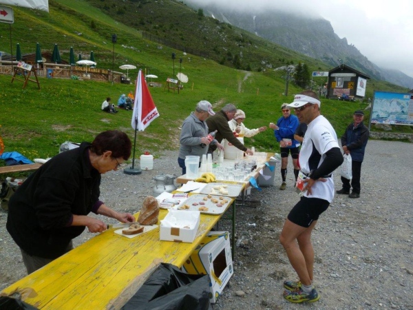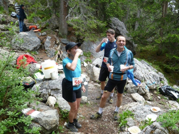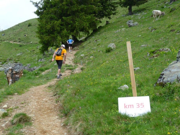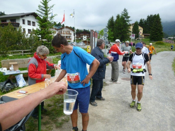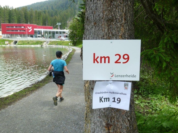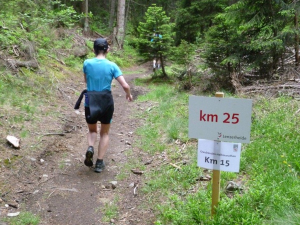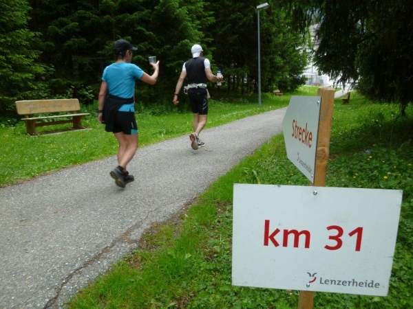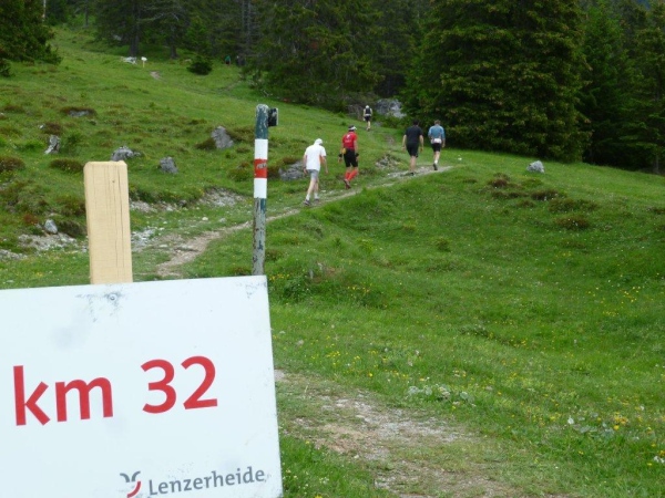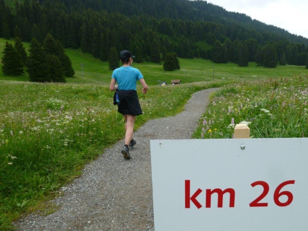 Das Rollen hat dort ein Ende, wo die Strecke scharf rechts abzweigt und zuerst über einen Wiesen-, dann einen matschigen Waldweg recht steil zum Kilometerschild 20 hinunterführt. Es geht noch einen weiteren Kilometer auf einem Fahrweg, dann ist wieder befestigter Untergrund und eine fast ebene Strecke unter den Füßen. Diese führt uns nach Parpan, wo ein umfangreiches Verpflegungsangebot den längsten autonomen Abschnitt - auch der nur 5,5km – beendet.