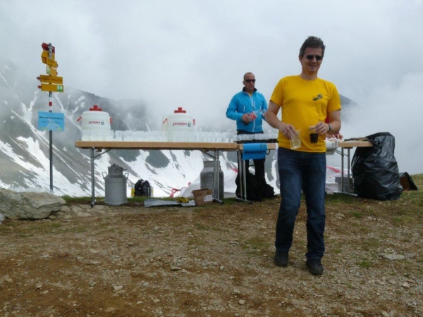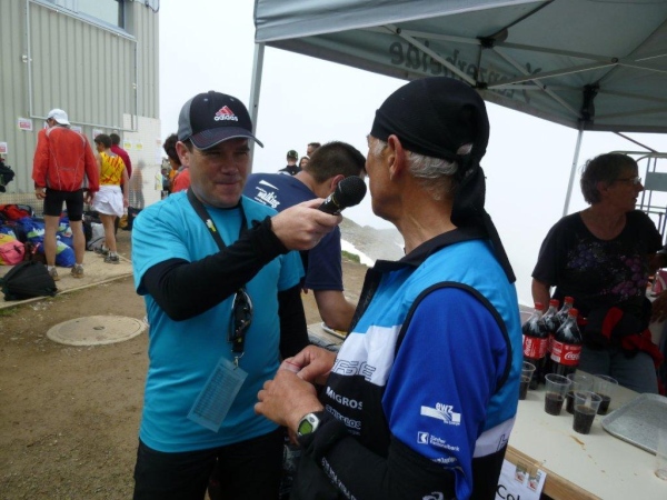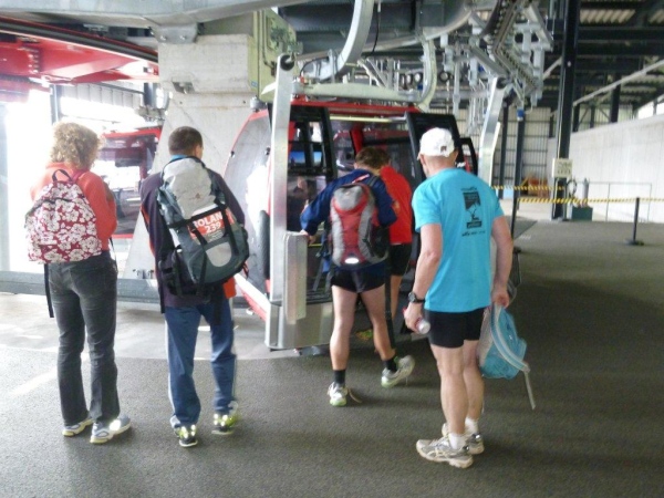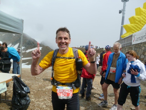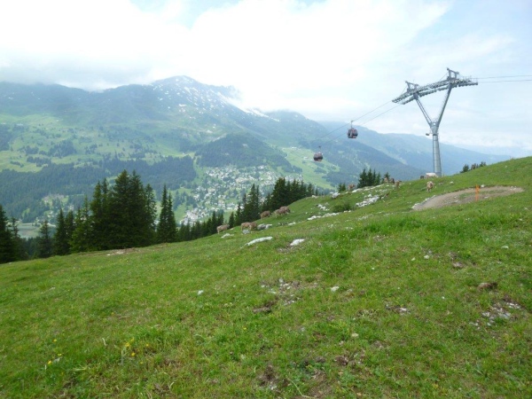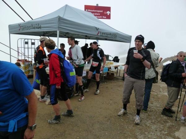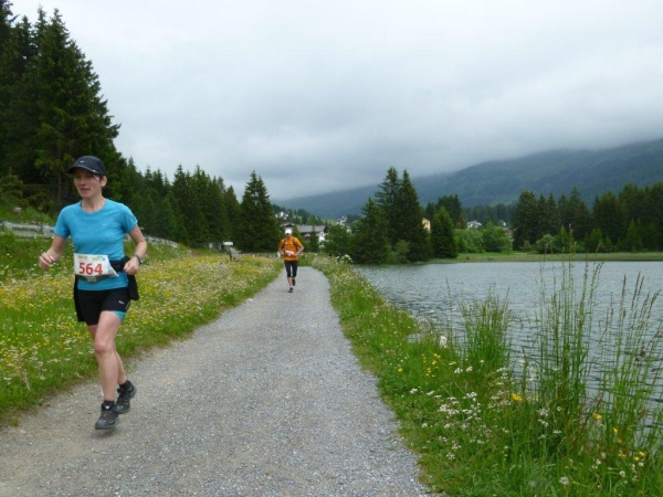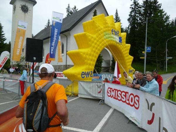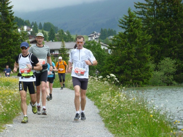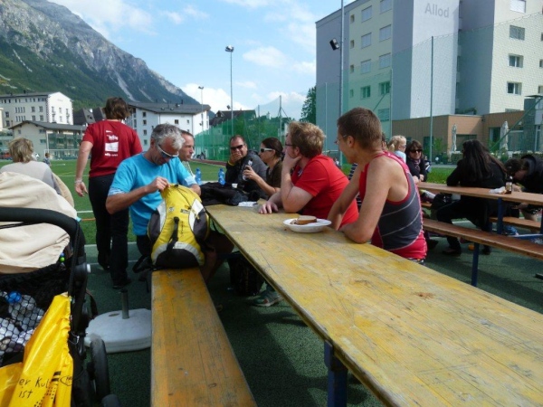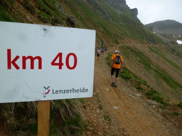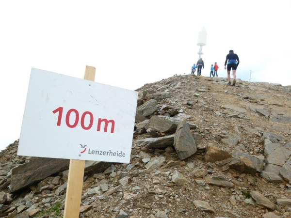 Vor der teilweisen Umrundung des Heidsees gibt es Verpflegung, während ihr ein paar fragende Blicke von Spaziergängern. Die Schlaufe führt in nächster Nähe an der Talstation der Gondelbahn vorbei. Wenn ich dann dort aussteige, habe ich 1400 Höhenmeter mehr in den Knochen. Nach einer kurzen Begegnungsstrecke werden wir in Lenzerheide in einer weiteren Schlaufe zum Sportplatz geführt, wo die Zwischenzeit genommen und Verpflegung angeboten wird. Feines Bauernbrot und Cola sind meine Diät, die mich hoffentlich den Berg hochbringen wird. Gut dreieinhalb Stunden habe ich für die gut 30 Kilometer bis hierher gebraucht. Wie lange werden die restlichen dauern?