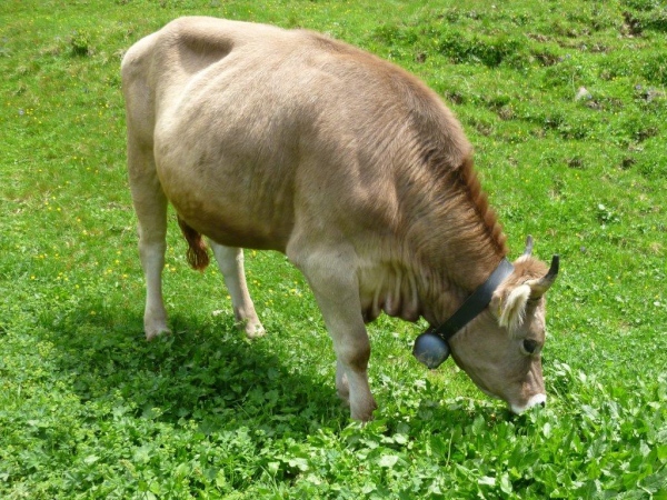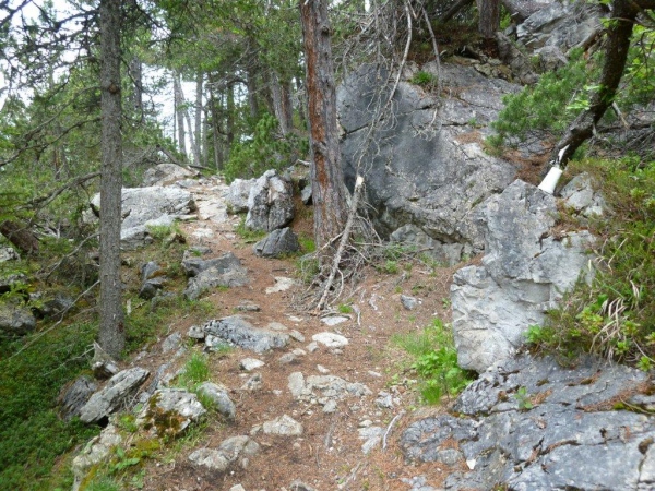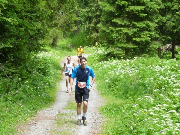 Irgendwo in diesem Wald ist an einem lauschigen Platz zwischen Nadelbäumen und Felsbrocken eine Verpflegungsstelle eingerichtet. Wer die Getränkebehälter bis hierhin geschleppt hat, ist mir ein Rätsel. Der Ort gefällt mir und ich würde gerne noch etwas länger hier verweilen, doch der Berg ruft. Noch ein paar Salzstangen in die Hand und weiter. Ein Trail vom Feinsten führt durch den Wald zu Alpweiden bei der Mittelstation Scharmoin. Von weitem kündet der Klang von Treicheln an, wohin wir zu laufen haben.