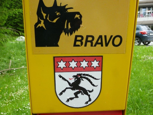 Das Dorf gibt unserem heutigen Ziel, dem Rothorn, den Namenszusatz und das Dorfwappen zeigt, welche Beziehung früher zu dem noch im Nebel liegenden Berg bestand. Der Goldene Bergmannschlägel oder Stollenhammer weist auf die 130 Jahre Kupferfahlerzabbau am Rothorn hin, der 1618 abrupt zu Ende ging, als die sich im Besitz der Schürfrechte befindliche Familie beim Bergsturz von Plurs (Bergell) ums Leben kam.
