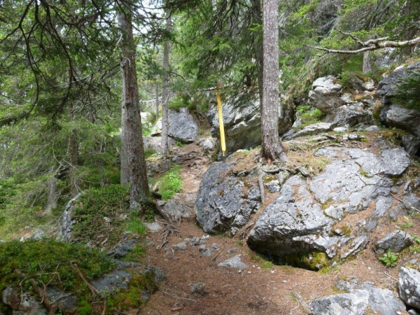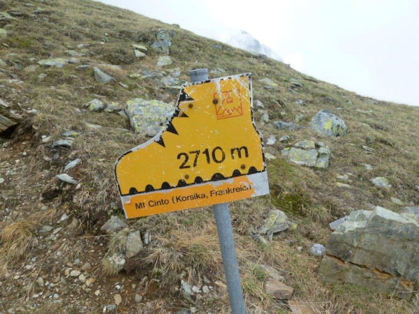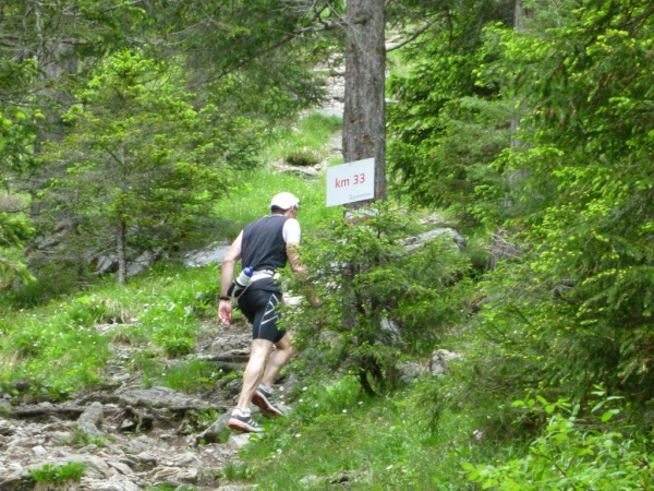 Im Dorf nimmt man nicht groß Notiz von uns Verrückten, da gebe ich mir selber Zuspruch und münze das „Bravo“ auf dem Kasten mit den Hundekot-Beuteln um zur Anerkennung für uns tapfere Läufer. Echte Belohnung gibt es aber schon wenig später im Anstieg. Der Wanderweg führt in einen idyllischen Bergwald, so richtig nach meinem Gusto. Der Wanderwegweiser kündet eine Marschzeit von 4 Stunden bis zum Gipfel an. Mit welchem Schnitt dabei zu rechnen ist, zeigt das Kilometerschild kurz danach: Die Zahl der verbleibenden Kilometer ist nur noch einstellig!