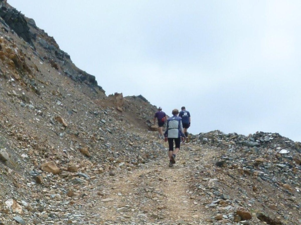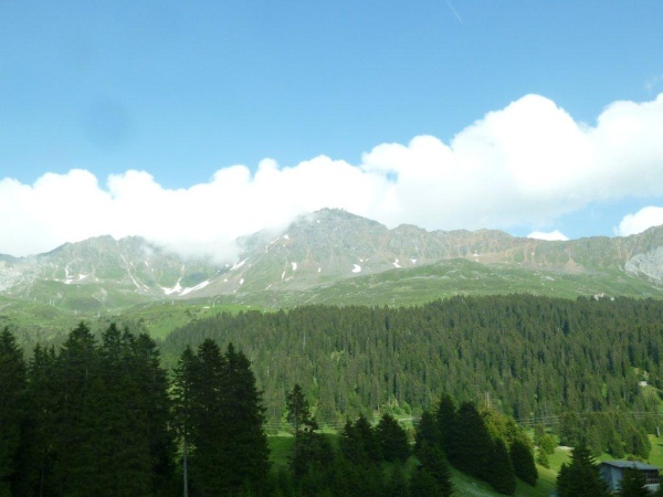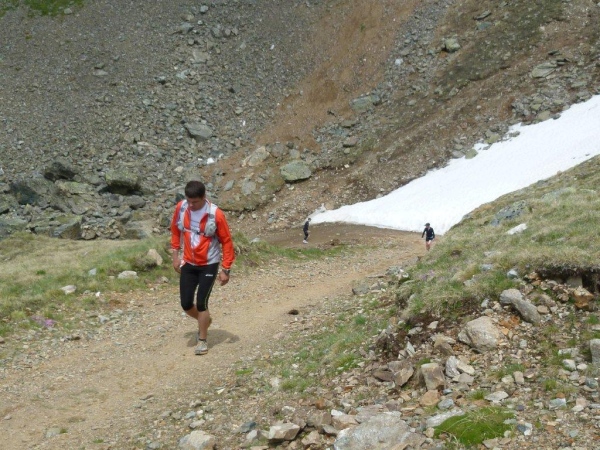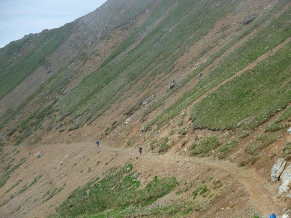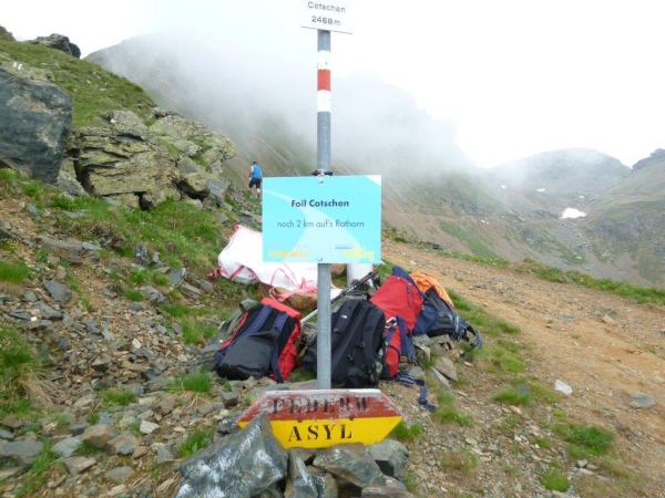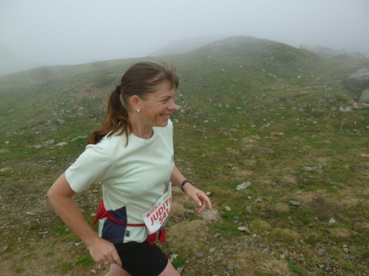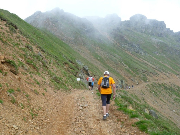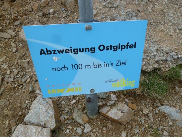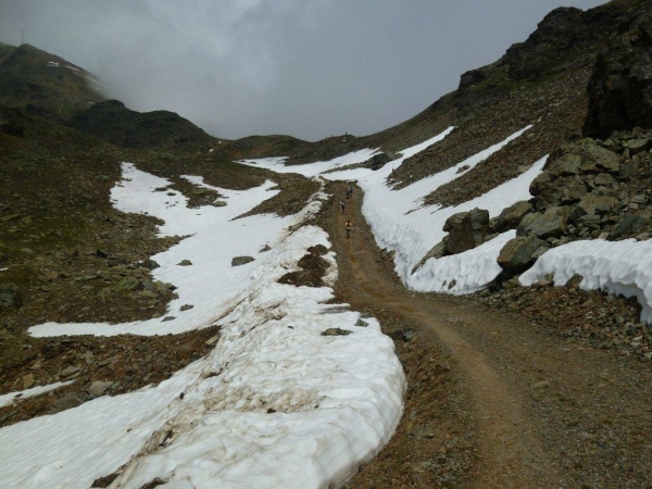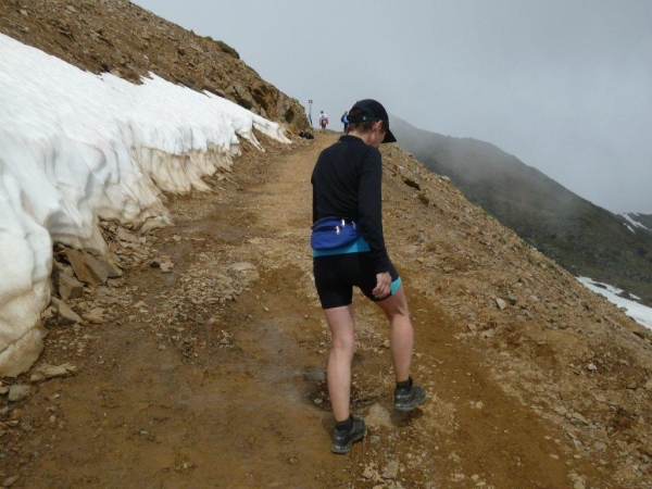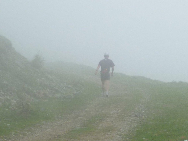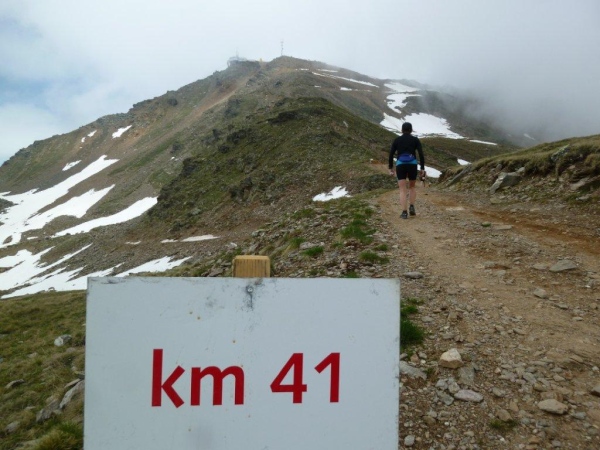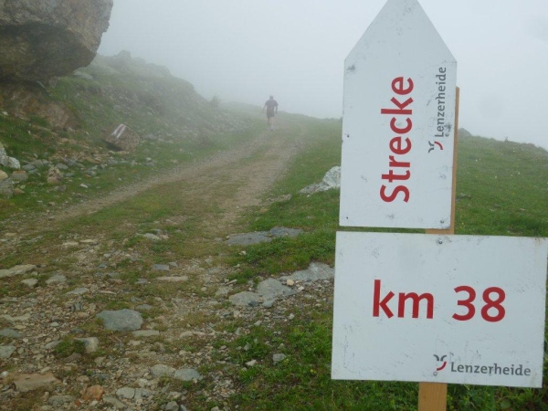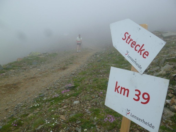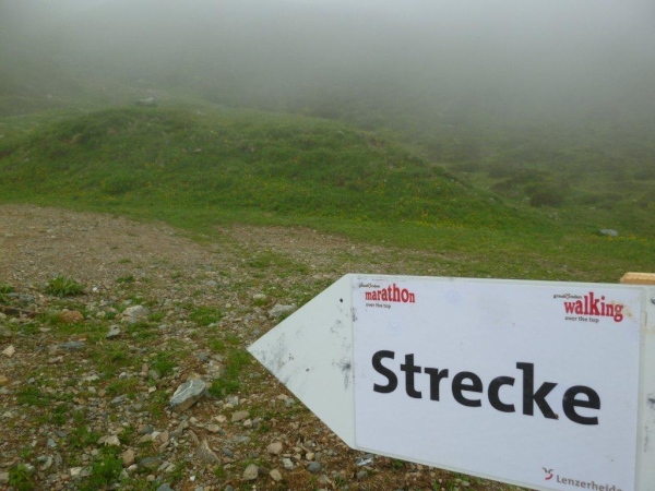 Eben waren wir in einer High-Heels-tauglichen Fußgängerzone der Kantonshauptstadt, schon sind wir in dem der harschen Witterung ausgesetzten Gebirge. Und das per pedes, nicht per Hubschrauber. Ein solcher wurde benötigt, um die Verpflegung zu Kilometer 40 zu bringen. Der Ausblick dort kam von selbst. Zur körperlichen Stärkung genieße ich die Aussicht, die sich zwischen letzten Wolkenfetzen bietet. Auch die Frage, die mich seit dem Studium des Streckenplans beschäftigt, bekomme ich beantwortet. Foil Cotschen heißt dieser Punkt. Dass das romanische Wort „cotschen“ rot bedeutet, so viel wusste ich, doch das Wort Foil konnte ich im Online-Wörterbuch nicht finden. Nun bekomme ich es übersetzt und gleichzeitig vor Augen geführt. Die Strecke führt nach dieser Wegbiegung nunmehr ziemlich eben unterhalb eines Bergkamms weiter. Das ist also der rote Grat, auf dessen Suche ich so weit gelaufen bin.