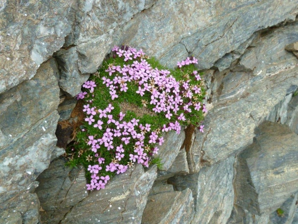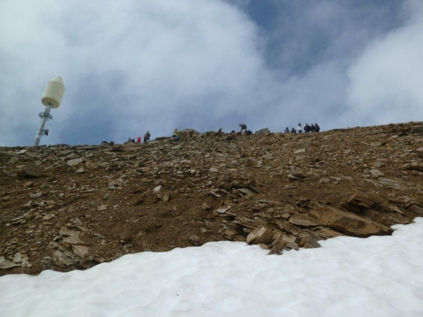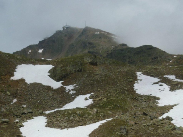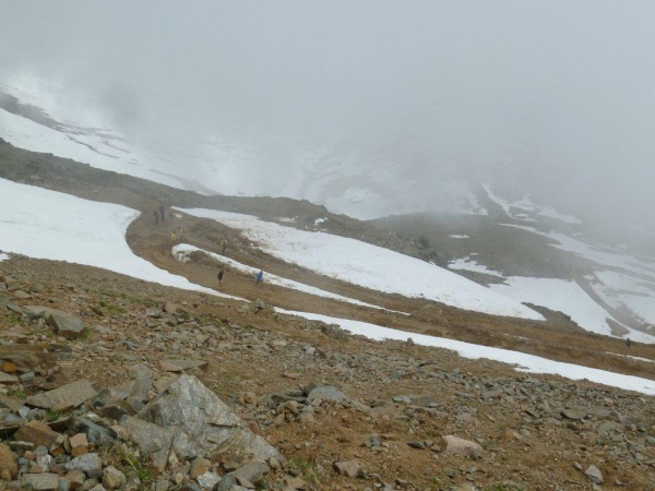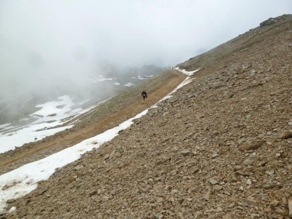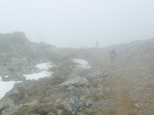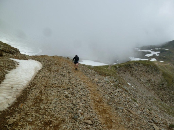 Keine zwei Kilometer und einige Alpenrosen später gibt es schon wieder Getränke. Der Blick nach vorne und nach oben macht allerdings fast schon Lust auf heiße Schokolade. Nachdem der Wind schon aufgefrischt hat, wartet nun das Nebelband darauf, bezwungen zu werden. Die Hoffnung, dieses durchbrechen und in der Höhe noch ein paar Sonnenstrahlen erhaschen zu können, gebe ich nicht auf. In dem Bereich, wo der Nebel sitzt, muss das Gras immer mehr Steinen und Geröll Platz machen, welches schon wenig später immer wieder unter Flecken von Schnee verborgen liegt.