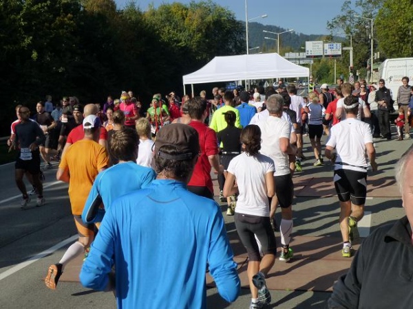 Der Wendepunkt ist bei km 7,5 am Rande des Golfclubs Andritz eingerichtet. Auf dem Rückweg sehe ich nun all die Läufer, die (noch) hinter mir sind und darf beruhigt feststellen, dass mich noch nicht alle überholt haben. Bis km 10 verläuft der Kurs weiterhin gegenläufig, dann werden wir abweichend von der bisherigen Strecke, aber weiterhin geradeaus führend auf die Körösistraße begleitet. Wohngebiete mit mehrstöckigen Häusern, allmählich in niedrigere und ältere Bebauung übergehend, prägen die Umgebung. Am Horizont rückt im Gegenlicht der Sonne langsam der Schlossberg näher.